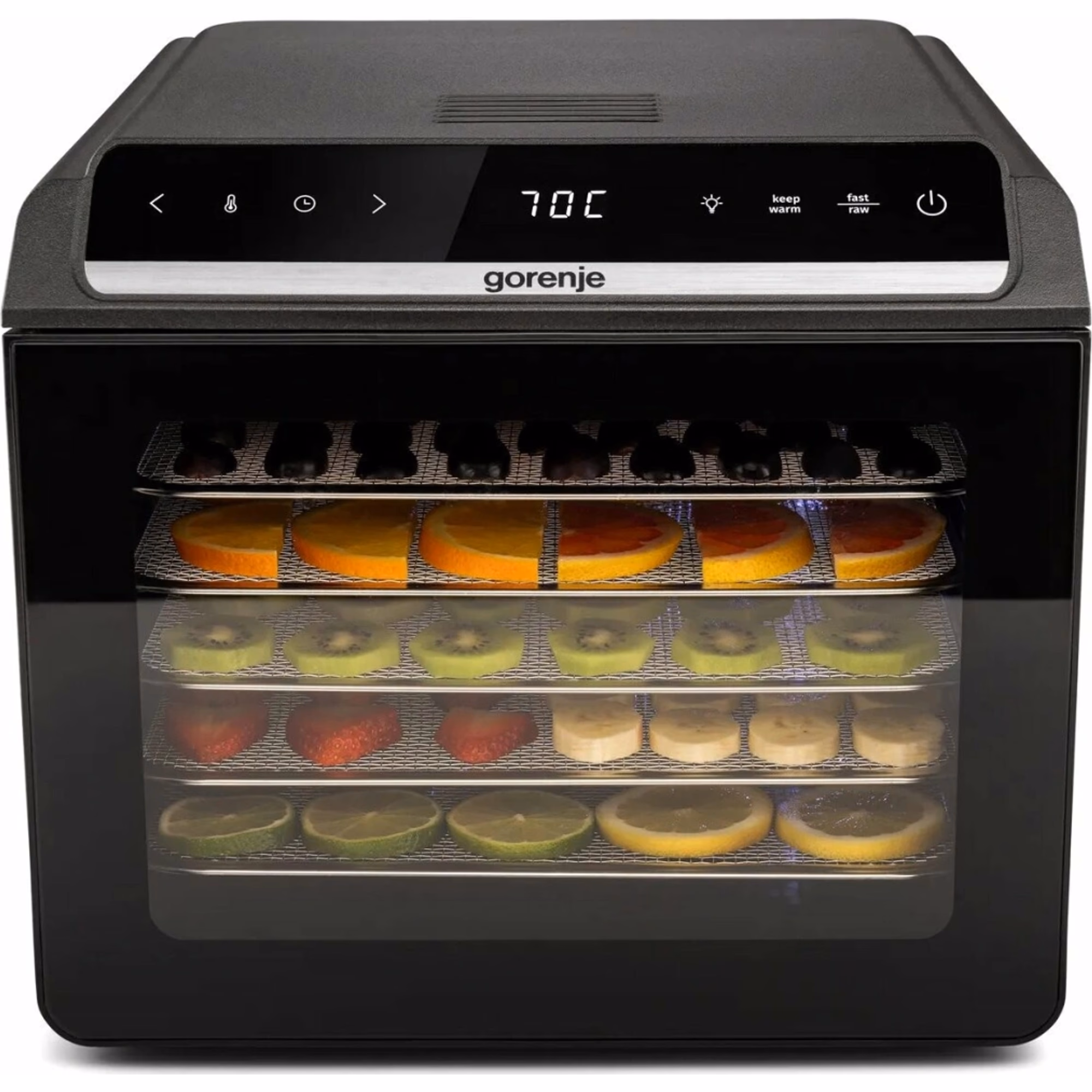 - Konstrukce a kapacita – Gorenje FDK600DB nabízí 6 nerezových sušicích plat o průměru 37,1 cm, magnetická dvířka s průhledem nebo integrované vnitřní osvětlení pro lepší přehled o průběhu sušení. Rovnoměrné sušení zajišťují horizontální proudění vzduchu a zadní ventilátor.