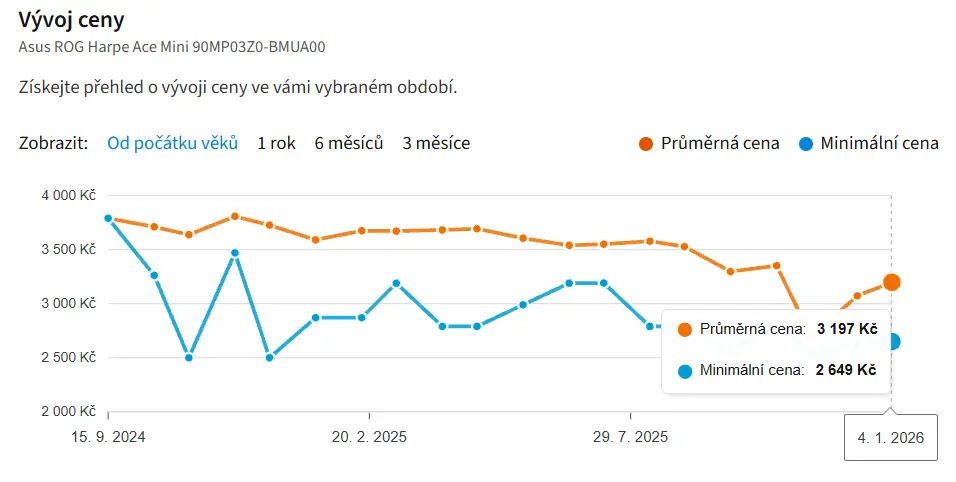 Foto: Oficiální materiály distributoraNaposledy se herní myš ASUS ROG Harpe Ace Mini Black prodávala za průměrnou cenu 3 197 Kč
