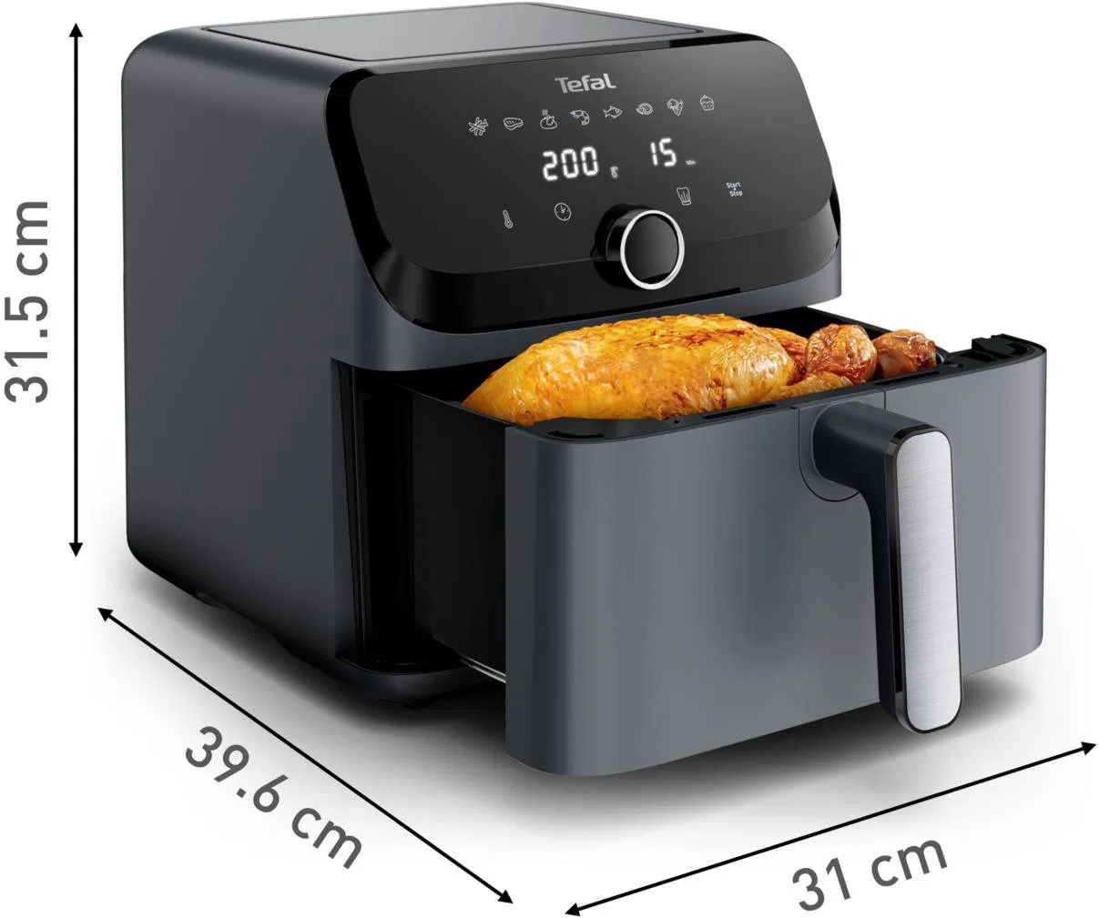 Velká horkovzdušná fritéza Tefal EY855BE0 Easy Fry Mega v XXL provedení připraví pokrmy bez oleje jako řešení pro vaše každodenní křupavé smažené jídlo ve zdravějším provedení. Její objem činí 7,5 litru, taková kapacita umožní přípravu až 8 porcí. Oproti použití klasické trouby s Tefal ušetříte až 65 % energie a připravíte pokrmy až o 37 % rychleji (dle testů z roku 2024 na mražených hranolkách). Výhodou je, že nabídne celkem 8 přednastavených programů, manuální program a přesné nastavené teploty a času od 80 °C do 200 °C s časovačem až na 60 minut.