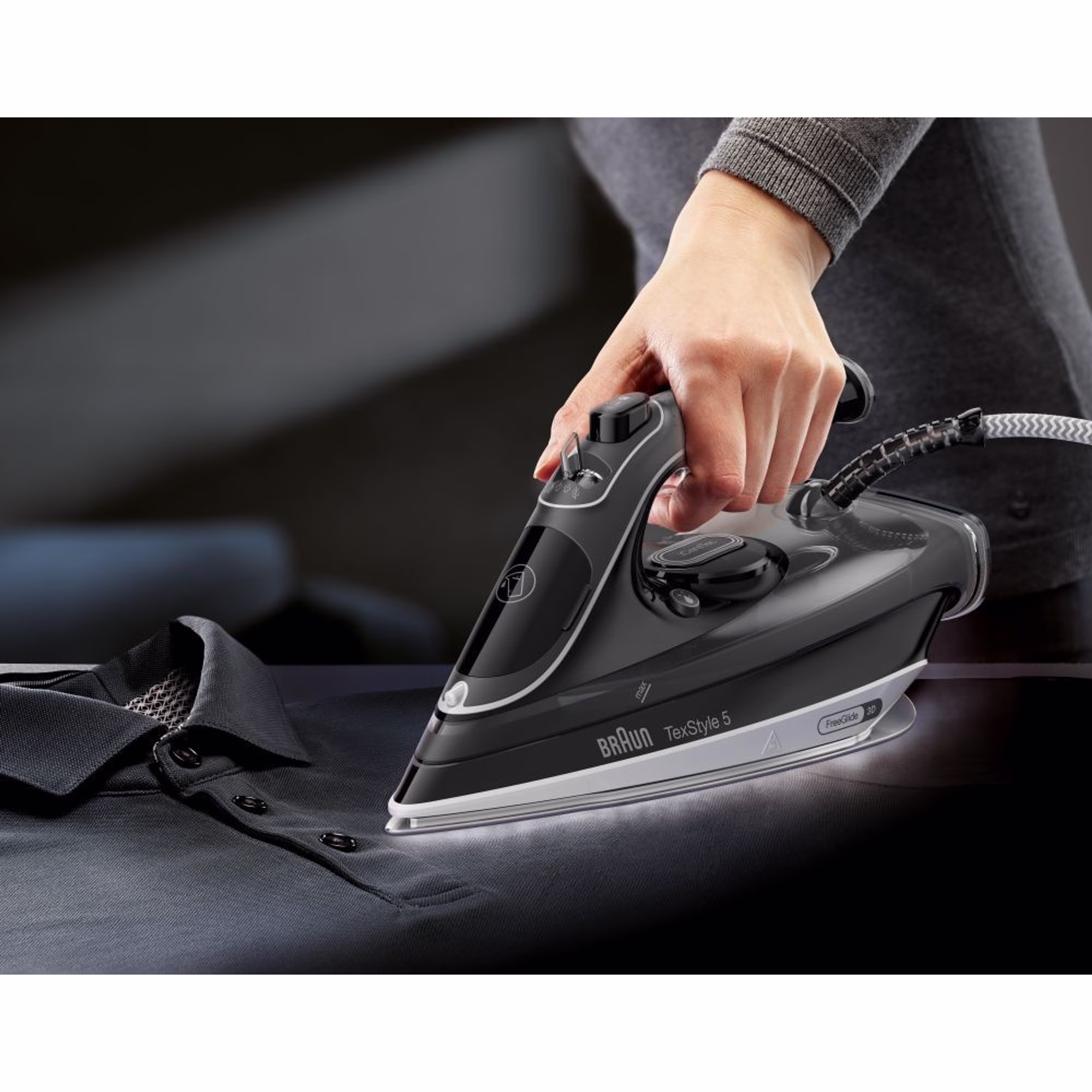- Péče o tkaniny a praktičnost – Braun SI5188BK disponuje technologií iCare, díky které vyberete správnou teplotu žehlení pro všechny druhy látek a předejdete tak jejich poškození. Pro rychlejší odstranění záhybů je k dispozici také funkce kropení a AntiDrip systém zase zabrání odkapávání vody a tvorbě skvrn. Nádržka na vodu s ergonomickým plněním má dostatečný objem 330 ml.