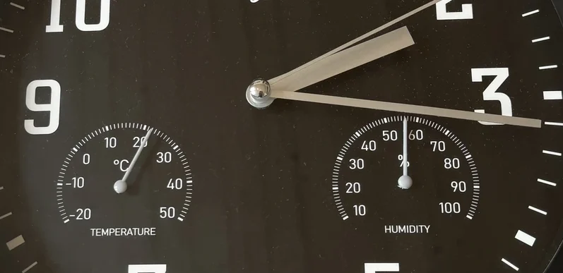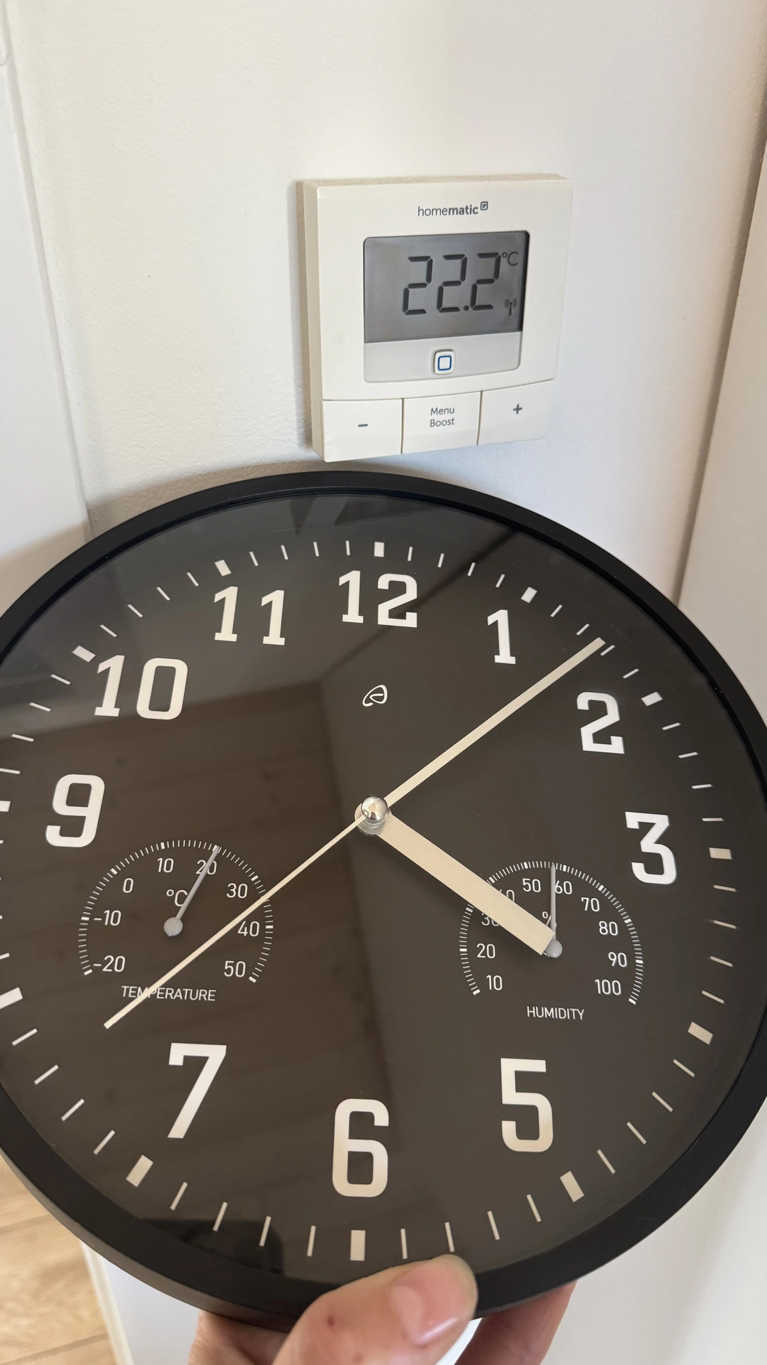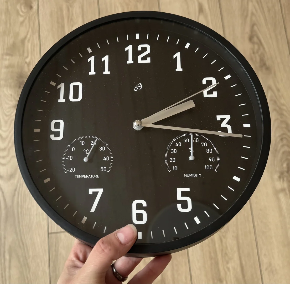 Součástí hodin jsou dva menší ciferníky pro teplotu a vlhkost. Jejich přesnost jsem porovnala se senzory v rámci domácího smart home systému (termostat v místnosti). Přesnost senzorů smart home potvrzuje meteostanice umístěna v téže místnosti a jejíž hodnoty se s termostatem shodují. Hodiny jsem v době měření umístila vedle termostatu, aby bylo měření co nejobjektivnější.