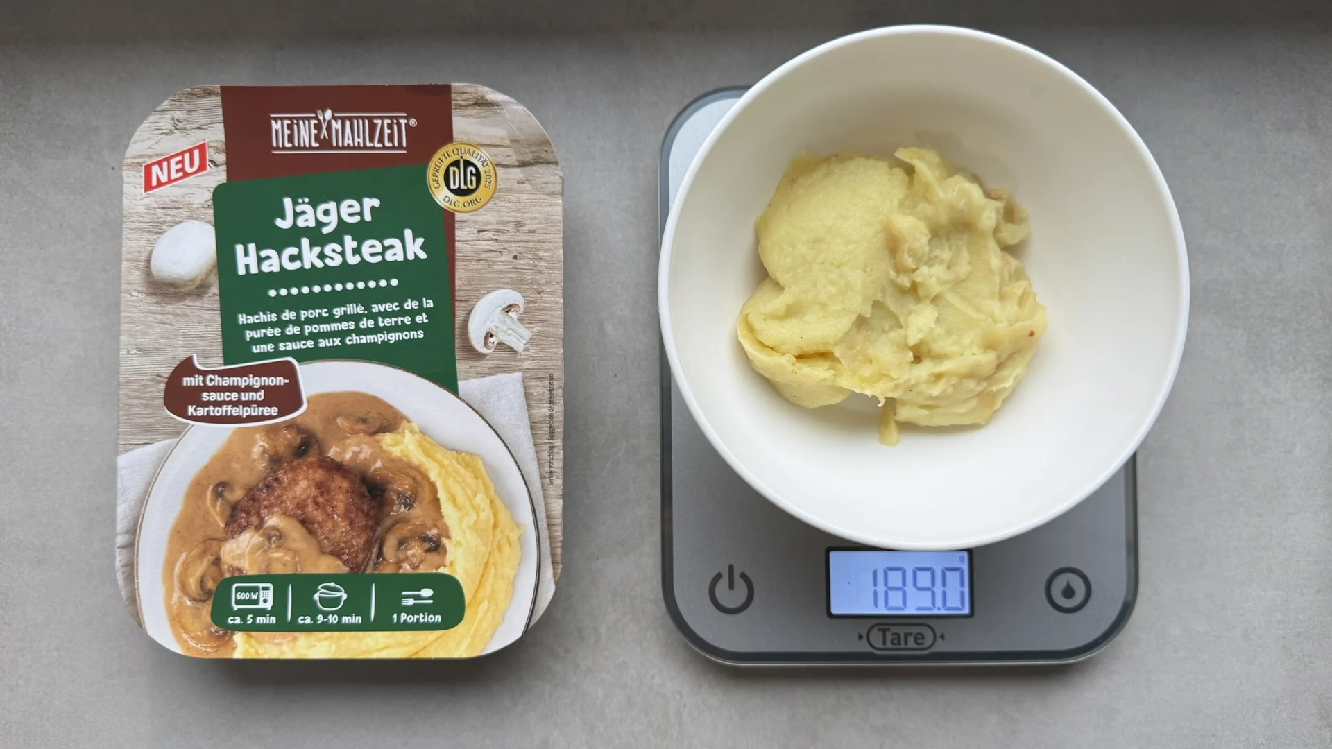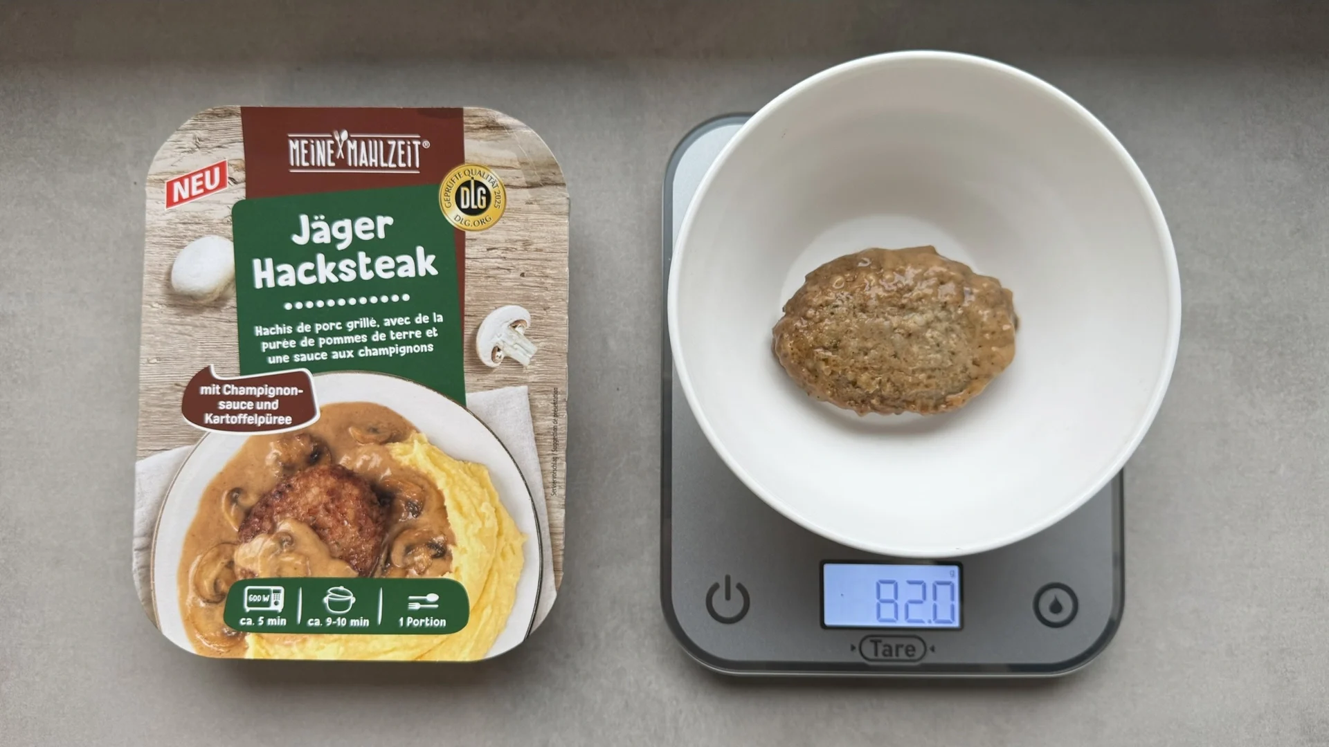 Tahle varianta vypadala už podle obalu slibně a chuť test to potvrdil. Kaše je jemná, byť trochu vodovější a bez máslové chuti (189 g), karbanátek měkký, kořeněný a poměrně slaný. Maso váží zhruba 82 gramů, což sice není mnoho, ale v kontextu ostatních hotovek jde o standard. Omáčka se žampiony mile překvapila – nepůsobí instantně, houby jsou skutečně znatelné a chutné. Za cenu 65 Kč nelze jídlu nic vyčítat.