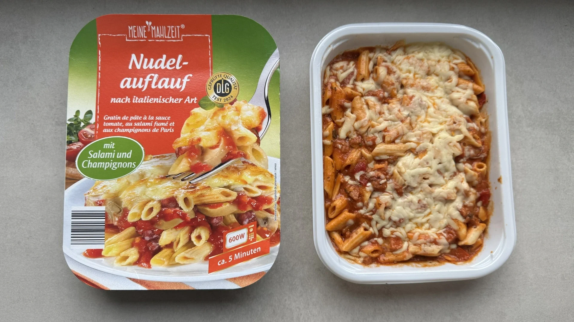 Těstoviny jsou připravené z kvalitní semolinové mouky, nejsou rozvařené, a celkově působí poctivě. Potěší i dostatek sýra a kousky zeleniny a žampionů. Na můj vkus je pokrm lehce nasládlý, salámu je jen kolem 9 % (tedy 36 gramů), takže chuť není úplně výrazná. Přesto jde o chutné, vyvážené jídlo, které funguje jako rychlá večeře nebo oběd do práce.