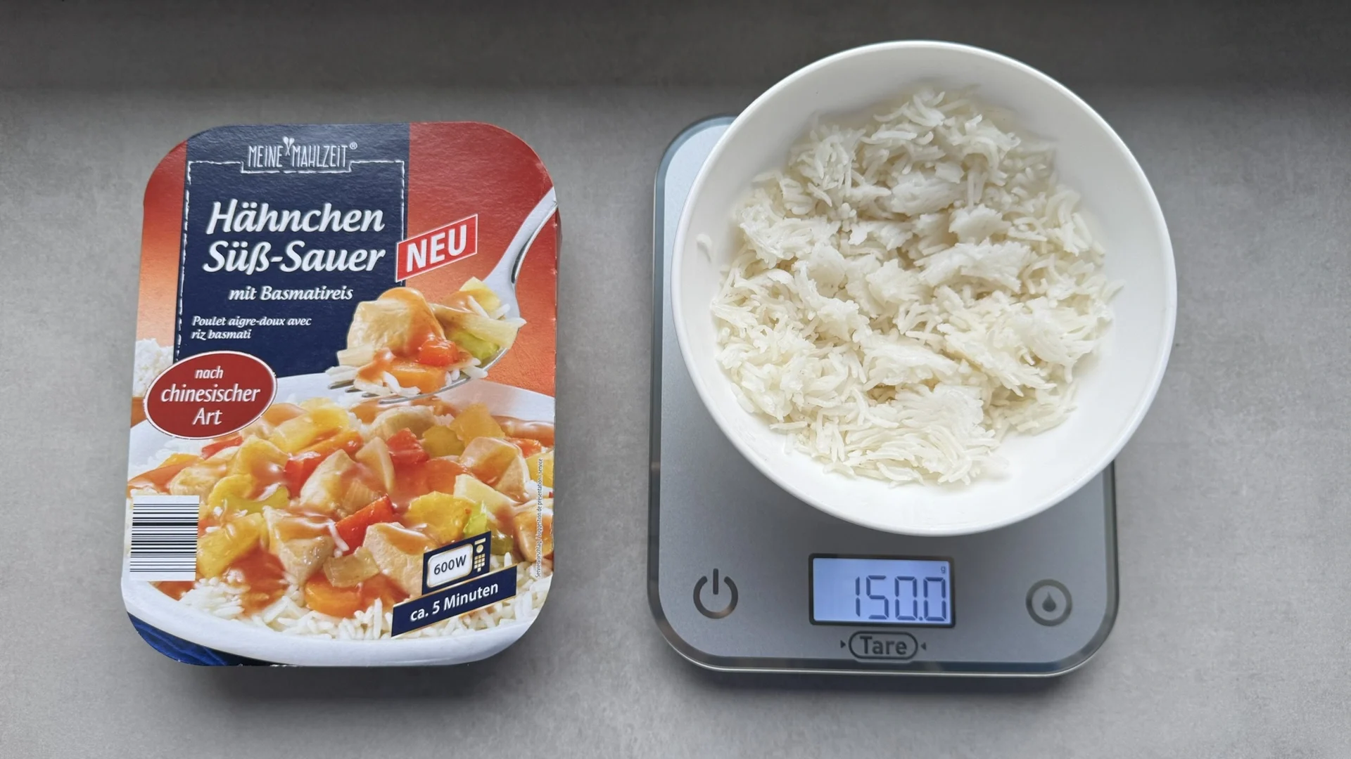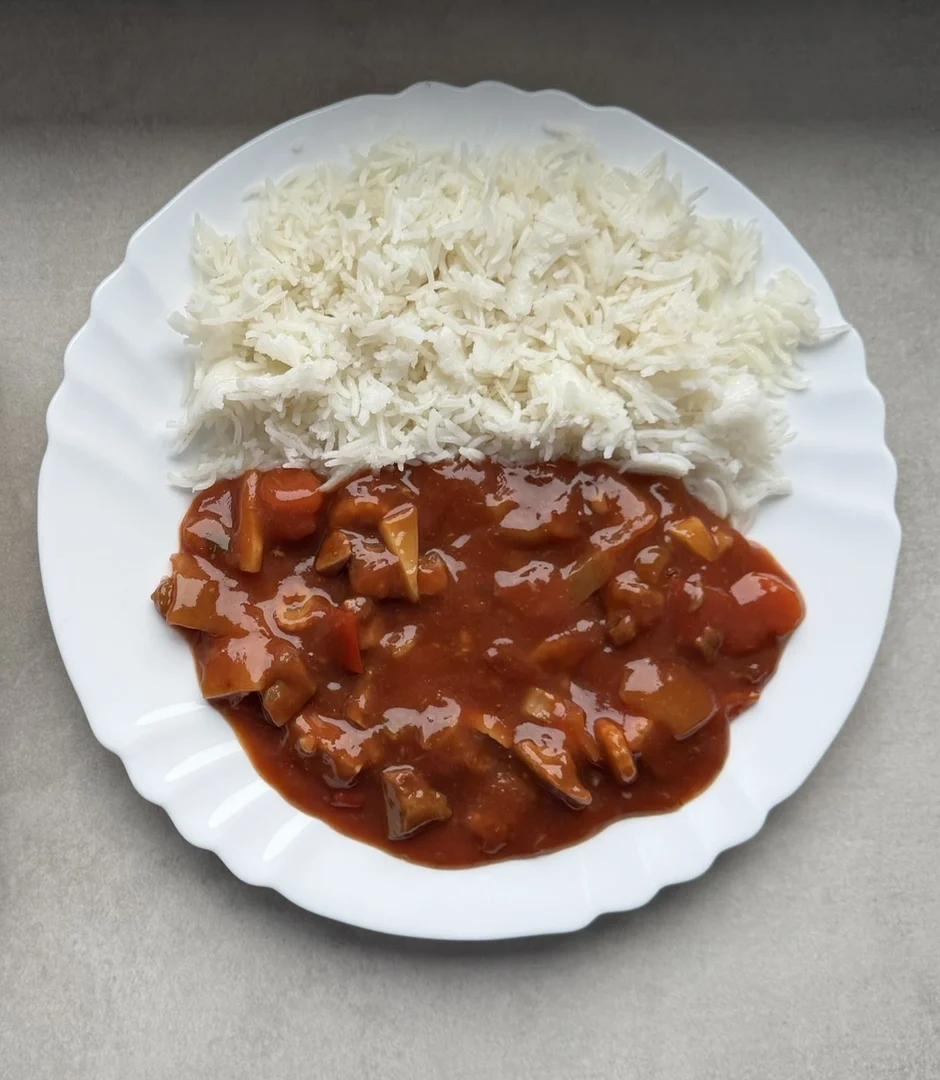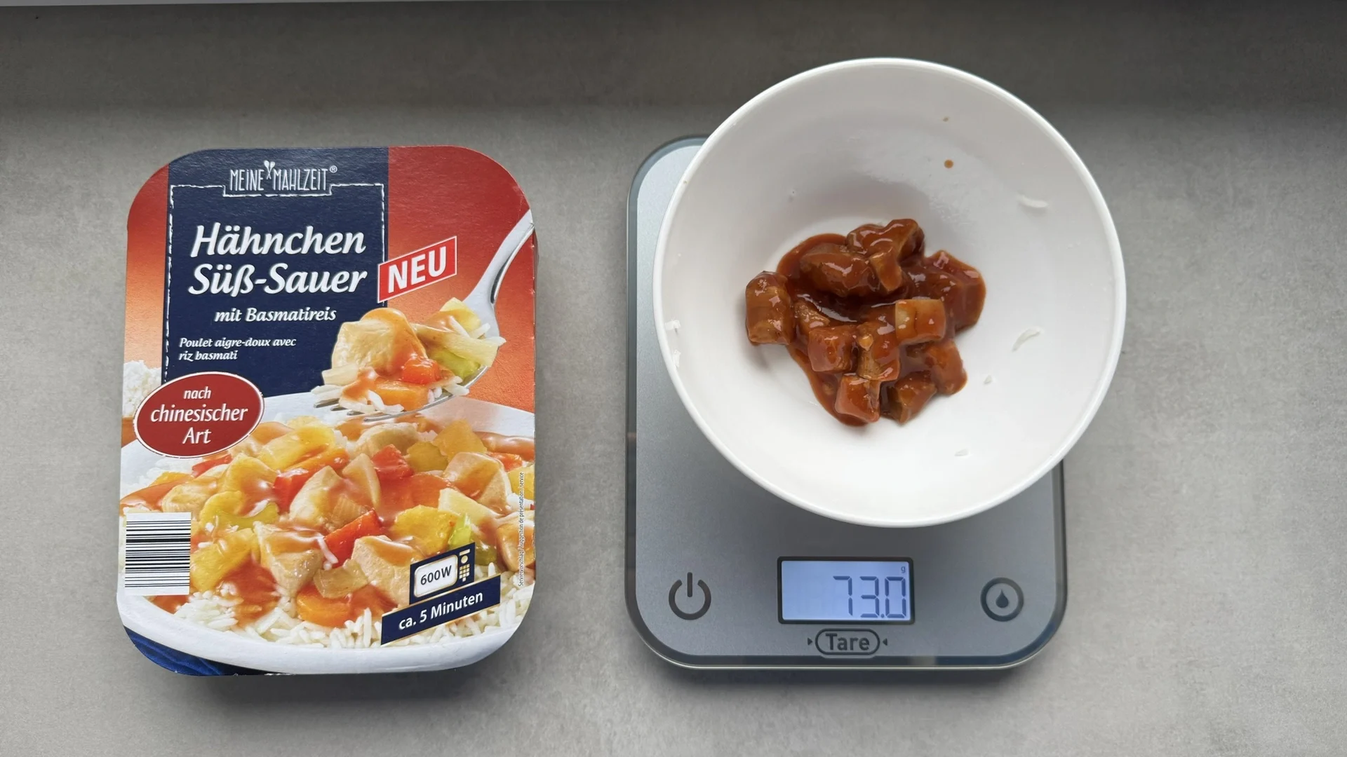 Zde mě nejvíc překvapil poměr masa a přílohy – kuřecího bylo jen asi 73 gramů, zato rýže basmati plná miska (150 g). Omáčka je chuťově vyvážená, byť dost sladká a kečupová, s lehkým chili dozvukem. Na čínský způsob bych čekala víc sojové omáčky, ale jinak jídlo působí přirozeně, bez výrazně umělých tónů
