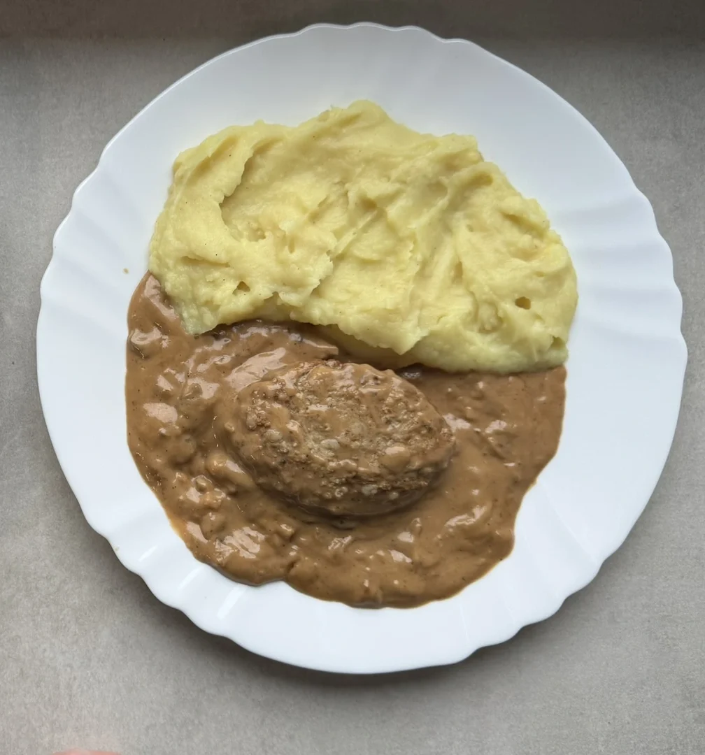 Tahle varianta vypadala už podle obalu slibně a chuť test to potvrdil. Kaše je jemná, byť trochu vodovější a bez máslové chuti (189 g), karbanátek měkký, kořeněný a poměrně slaný. Maso váží zhruba 82 gramů, což sice není mnoho, ale v kontextu ostatních hotovek jde o standard. Omáčka se žampiony mile překvapila – nepůsobí instantně, houby jsou skutečně znatelné a chutné. Za cenu 65 Kč nelze jídlu nic vyčítat.