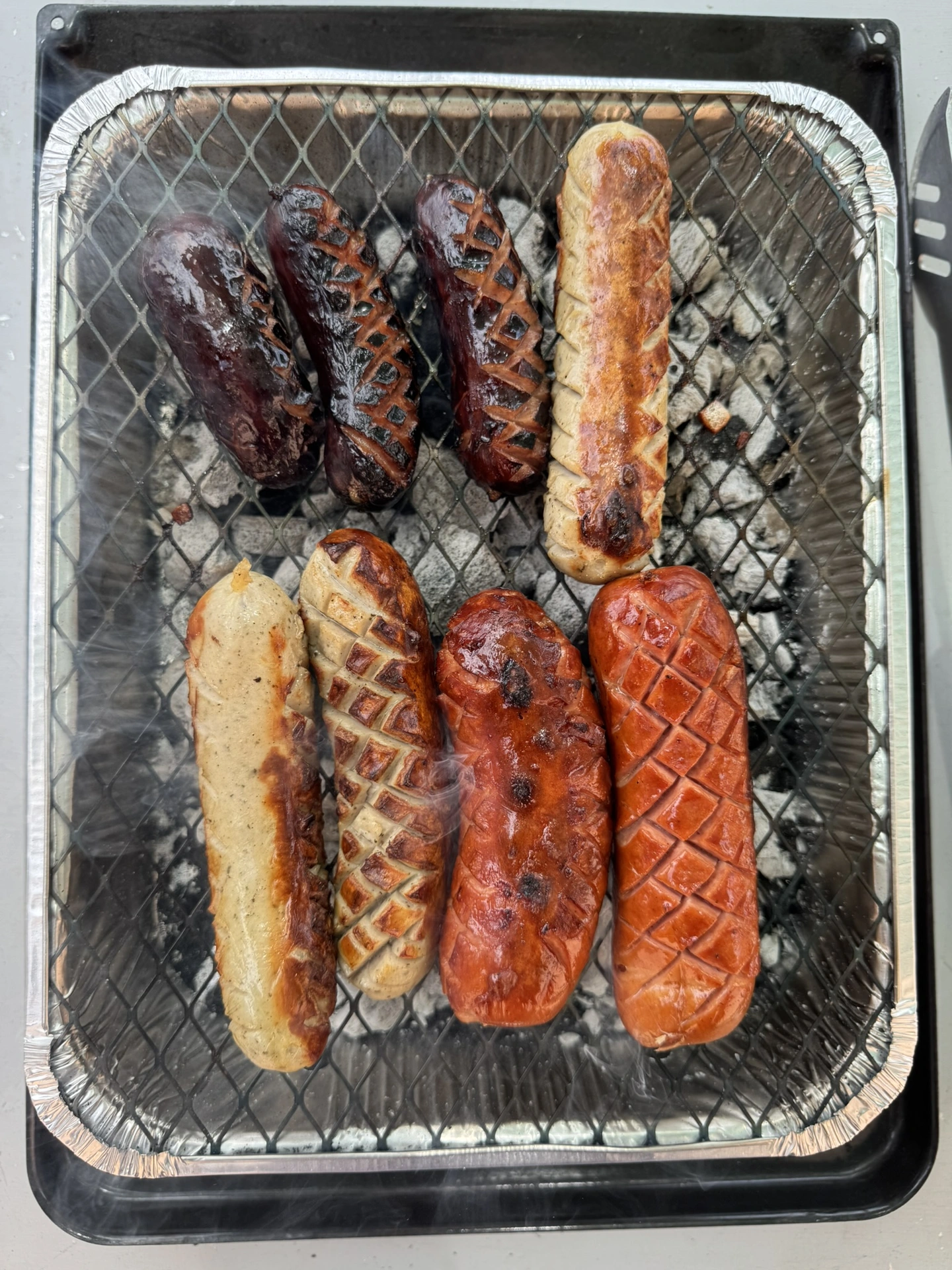 Na gril jsme naskládali špekáčky a menší klobásky – celkem 8 kusů uzenin. Na mřížku 30 x 23 cm by se pohodlně vešly ještě další dva buřty. Doba opékání trvala 17 minut, uzeniny jsme průběžně otáčeli. Výsledek byl víc než uspokojivý. Buřty byly pěkně propečené a chuťově velmi dobré, jako byste je opékali přímo nad ohněm.