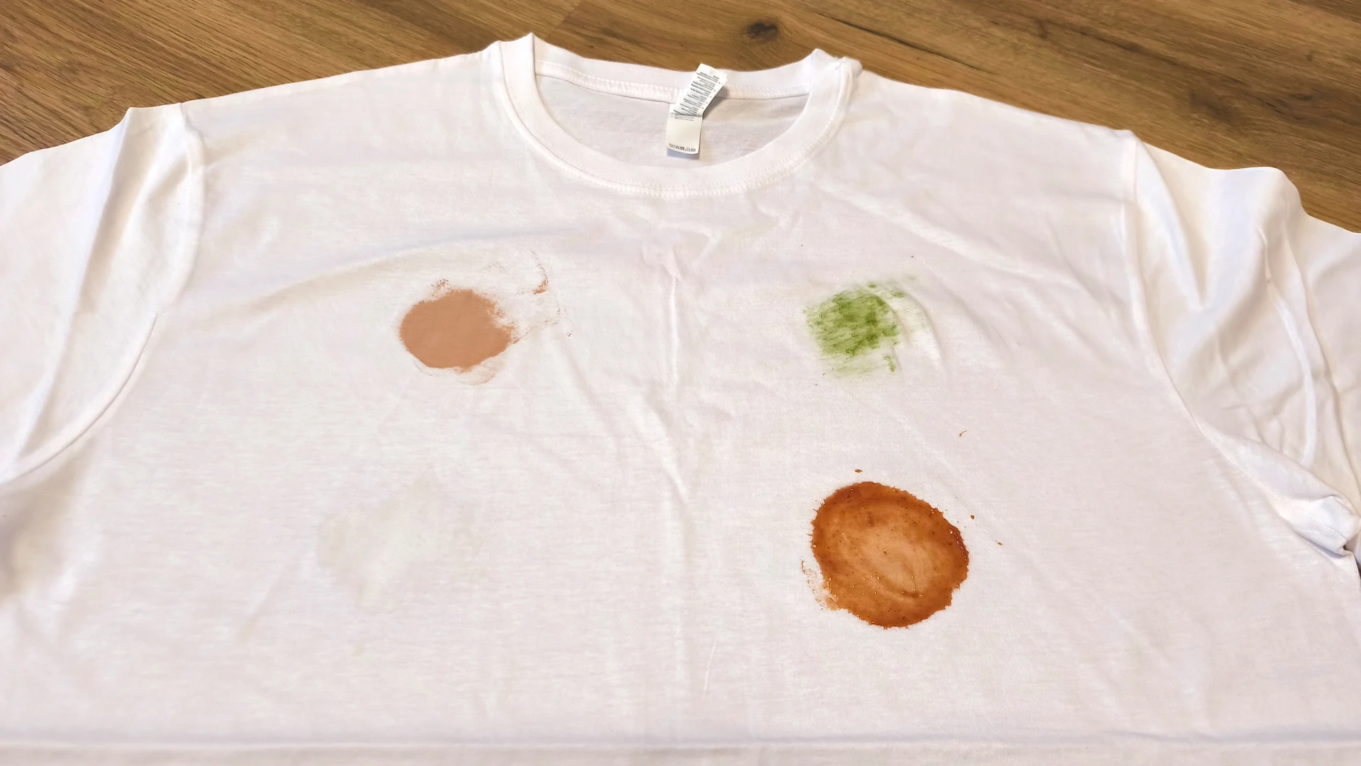 Make-up jsme nanášeli na bílá bavlněná trička, aby byly dobře vidět rozdíly, a nechali jsme ho zaschnout. Použili jsme odolný, silně pigmentovaný make-up, který se pere opravdu špatně.