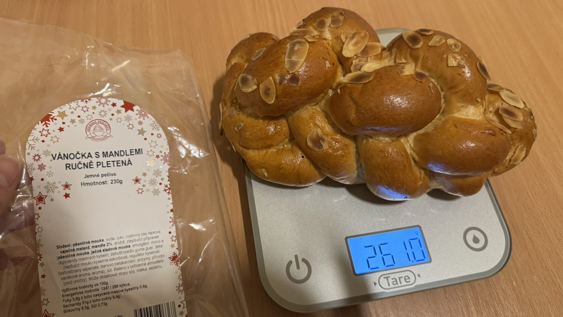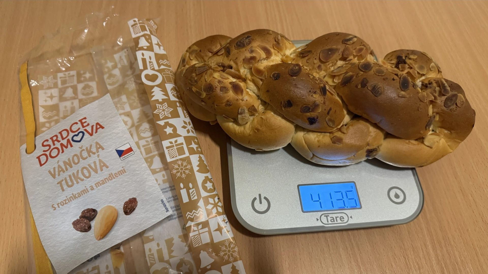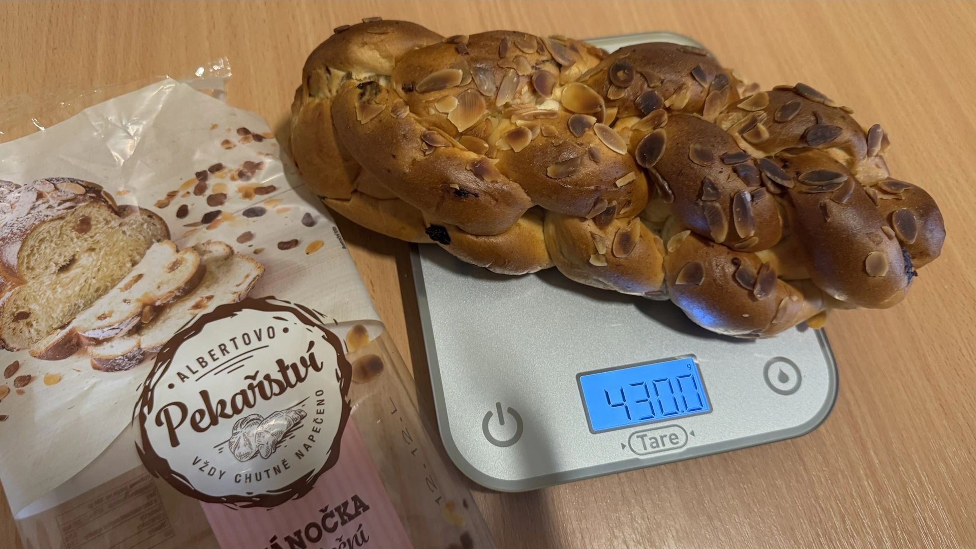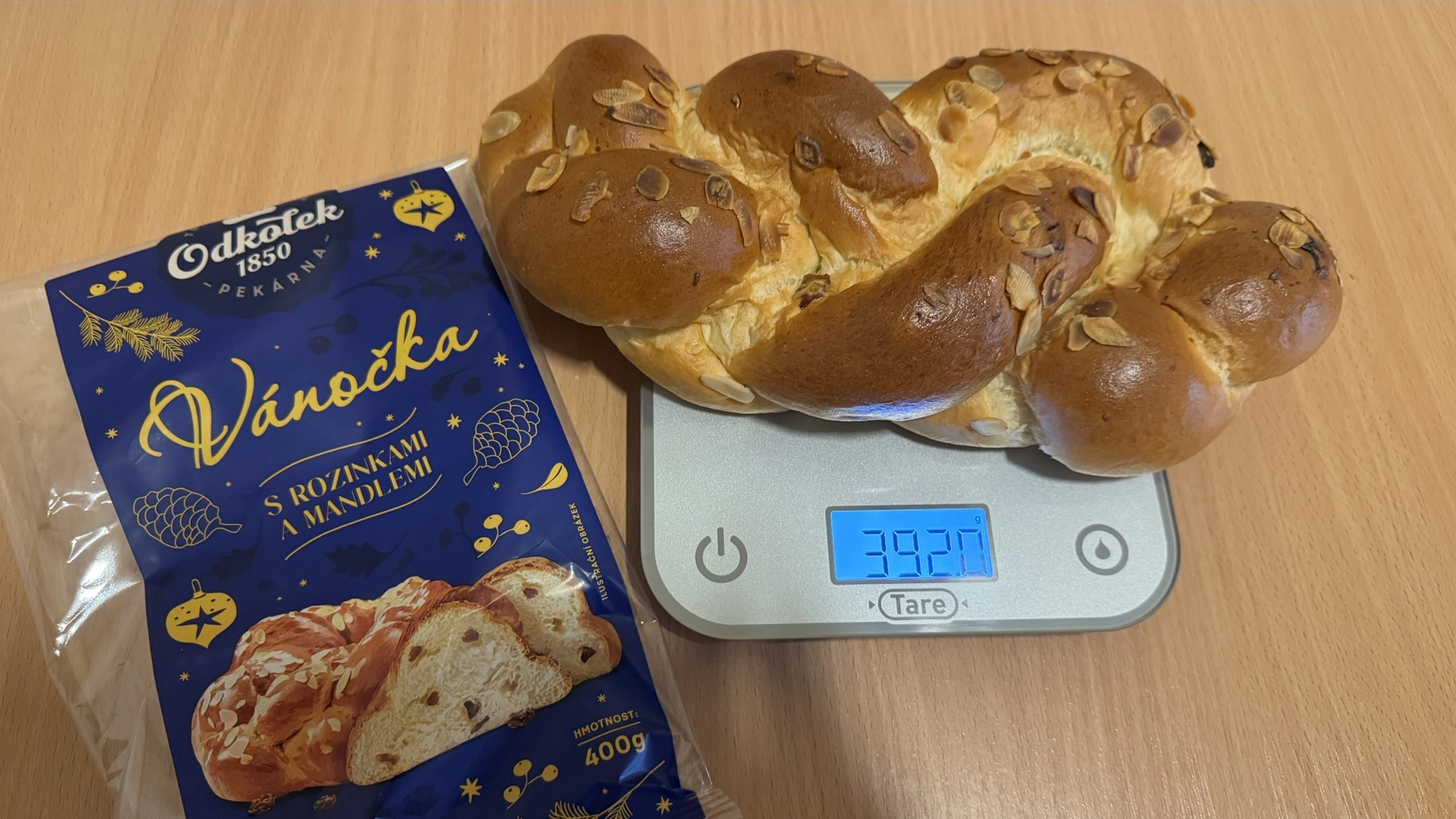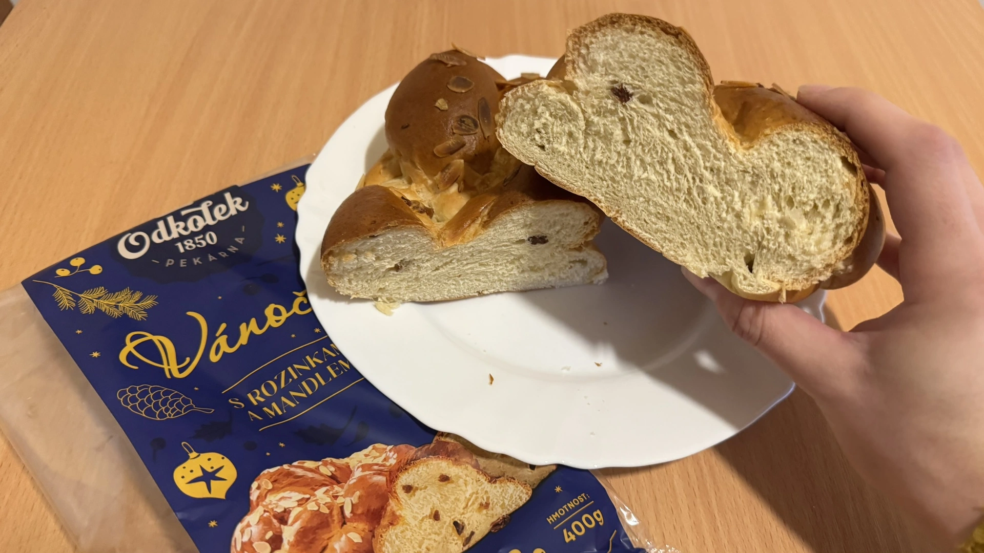 Albert překvapil výraznou sladkou kvasnicovou vůní a chutí, která připomíná domácí vánočku. Obsahuje nejvíce rozinek (6,5 %) i mandlí (2,5 %), což jí dodává typicky sváteční charakter. Textura je vláčná, dobře propečená a celkově působí poctivě. Sladkost je akorát, pro někoho možná mírnější, ale velmi vyvážená. Za cenu 13,73 Kč / 100 g jde o výborný poměr cena/kvalita.