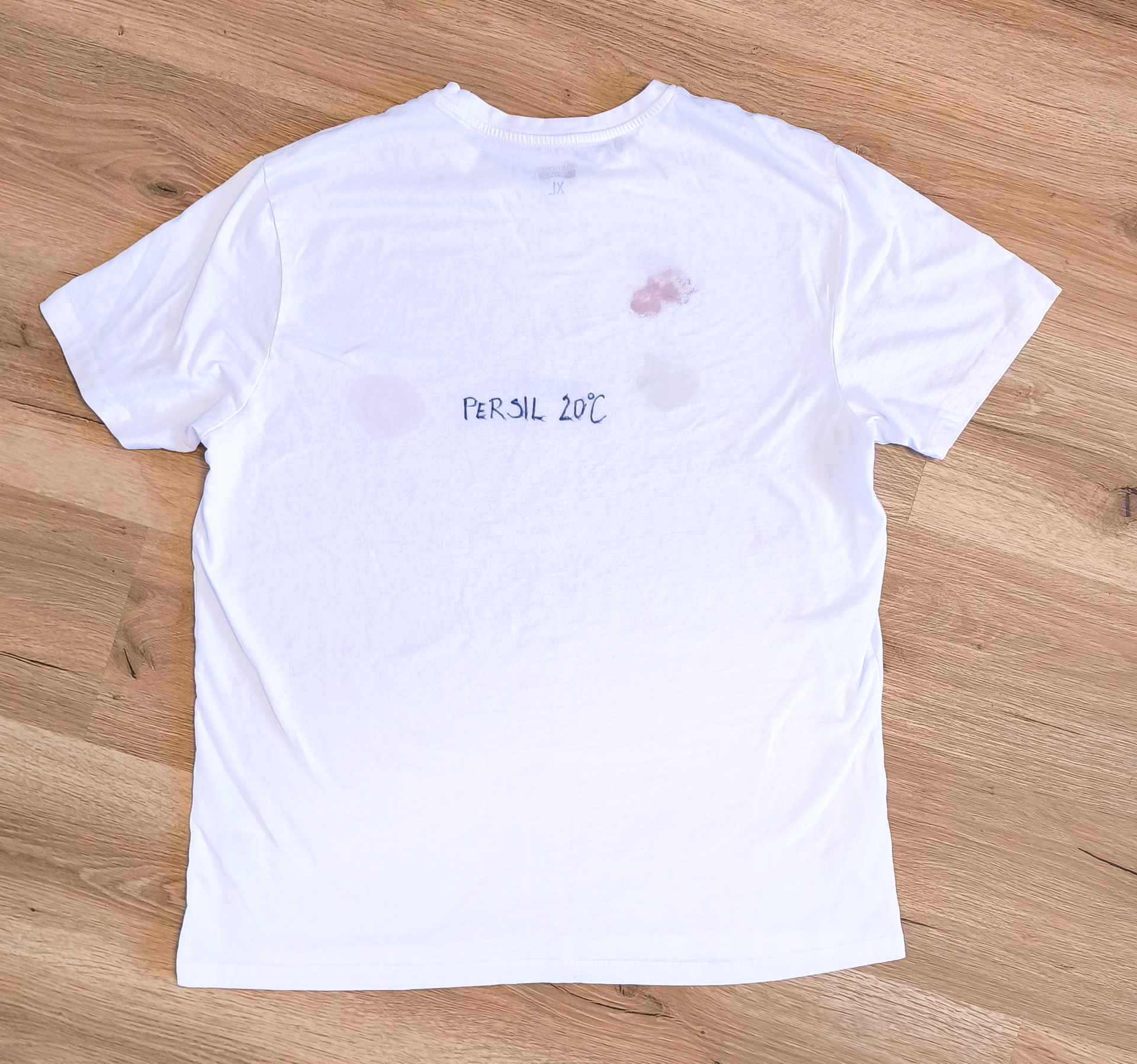 Test jsme nastavili tak, aby co nejvíc odpovídal běžnému praní doma a zároveň šel férově porovnat: skvrny jsme nanášeli na bílá bavlněná trička, aby byl výsledek dobře vidět. Ve všech případech jsme použili stejný prací prášek Persil a stejné dávkování. Nepoužili jsme předpírku, odstraňovač skvrn ani žádné ruční předčištění, protože cílem bylo zjistit, co zvládne samotný prášek v kombinaci s danou teplotou. Trička jsme před samotným praním na 30 minut namočili s doporučeným množstvím pracího prášku a měnila se jen teplota – v tomto případě 20 °C.