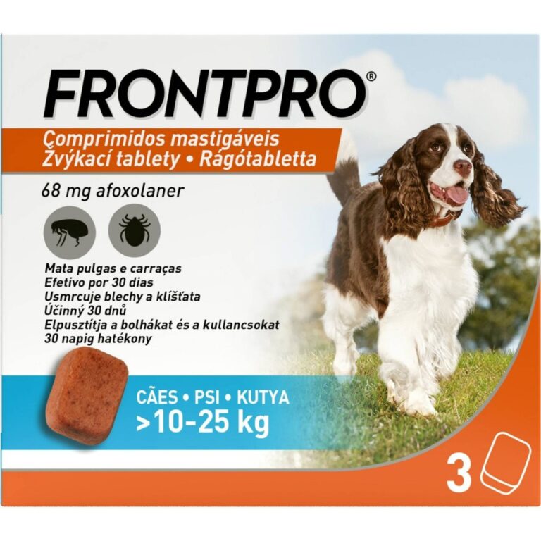 Pokud nechcete psovi na celou sezónu nasazovat obojek, vyzkoušejte žvýkací tablety Frontpro pro psy v hmotnostní kategorii 10 – 25 kg (k dostání jsou také tablety Frontpro pro větší psy o hmotnosti 25 – 50 kilogramů). Jedno balení obsahuje 3 tablety s příchutí hovězího masa pro snadnou aplikaci, přičemž jedna tableta má účinnost 30 dní. Poté je třeba aplikovat další tabletu.