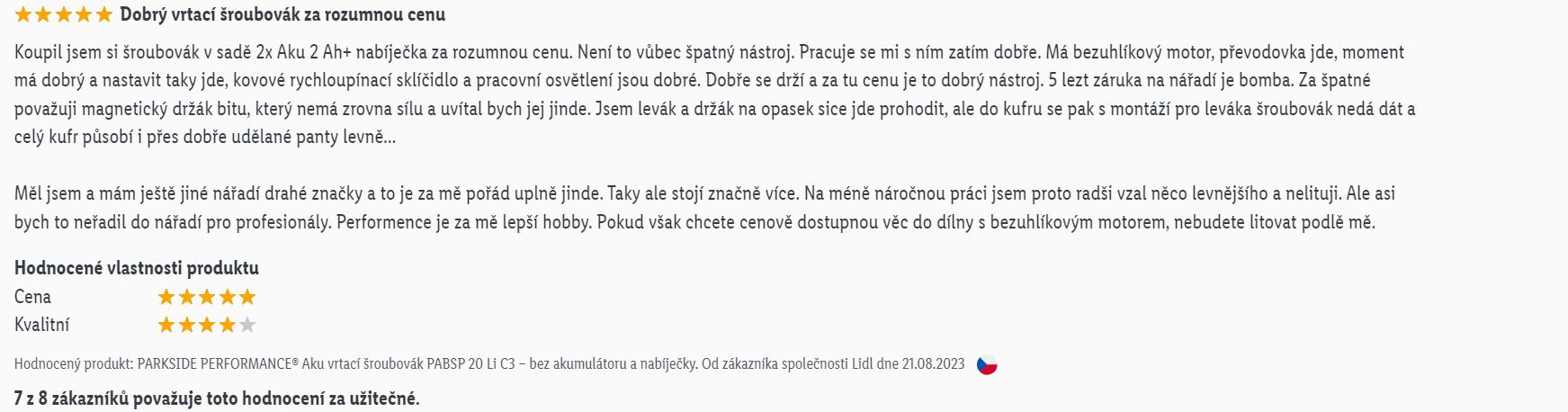 Aku vrtací šroubovák s podobným utahovacím momentem sice koupíte i levněji, ale jedná se o uhlíkové provedení. Srovnatelné kompaktní nářadí s bezuhlíkovým motorem pod 2 000 Kč neseženete. Parkside Performance PABSP 20 Li C3 tedy nabízí naprosto bezkonkurenční cenu a bezkonkurenční pětiletou záruku bez nutnosti registrace (u ostatních výrobců je pro získání prodloužené záruky nutná registrace).