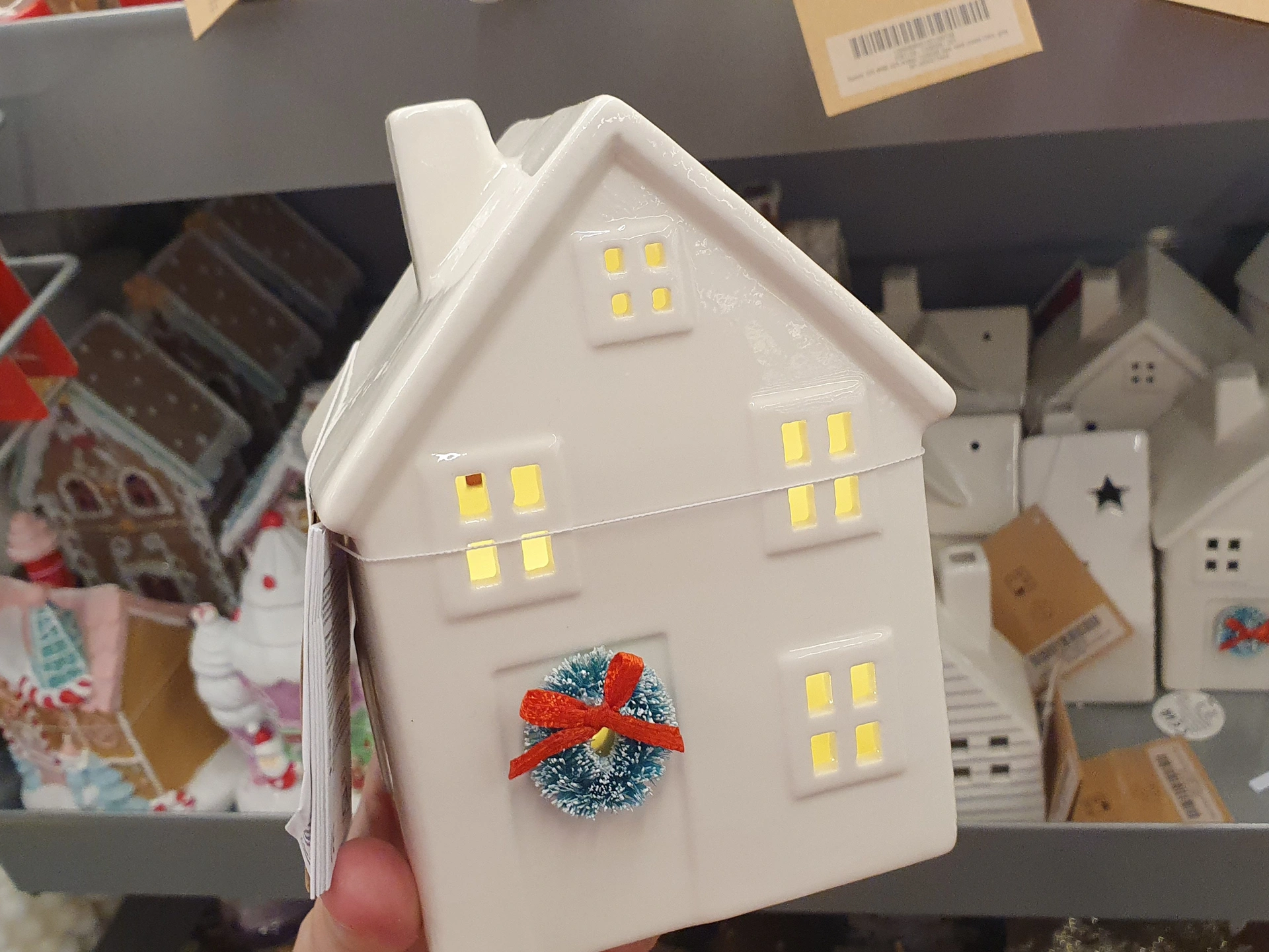 Čistě bílý domeček uvnitř září teplým LED světlem a na dveřích jej zdobí zelený věnec s červenou mašličkou, který je navíc zasněžený. Domeček působí velmi jemným a minimalistickým dojmem, zároveň mu díky věnci nechybí vánoční atmosféra.