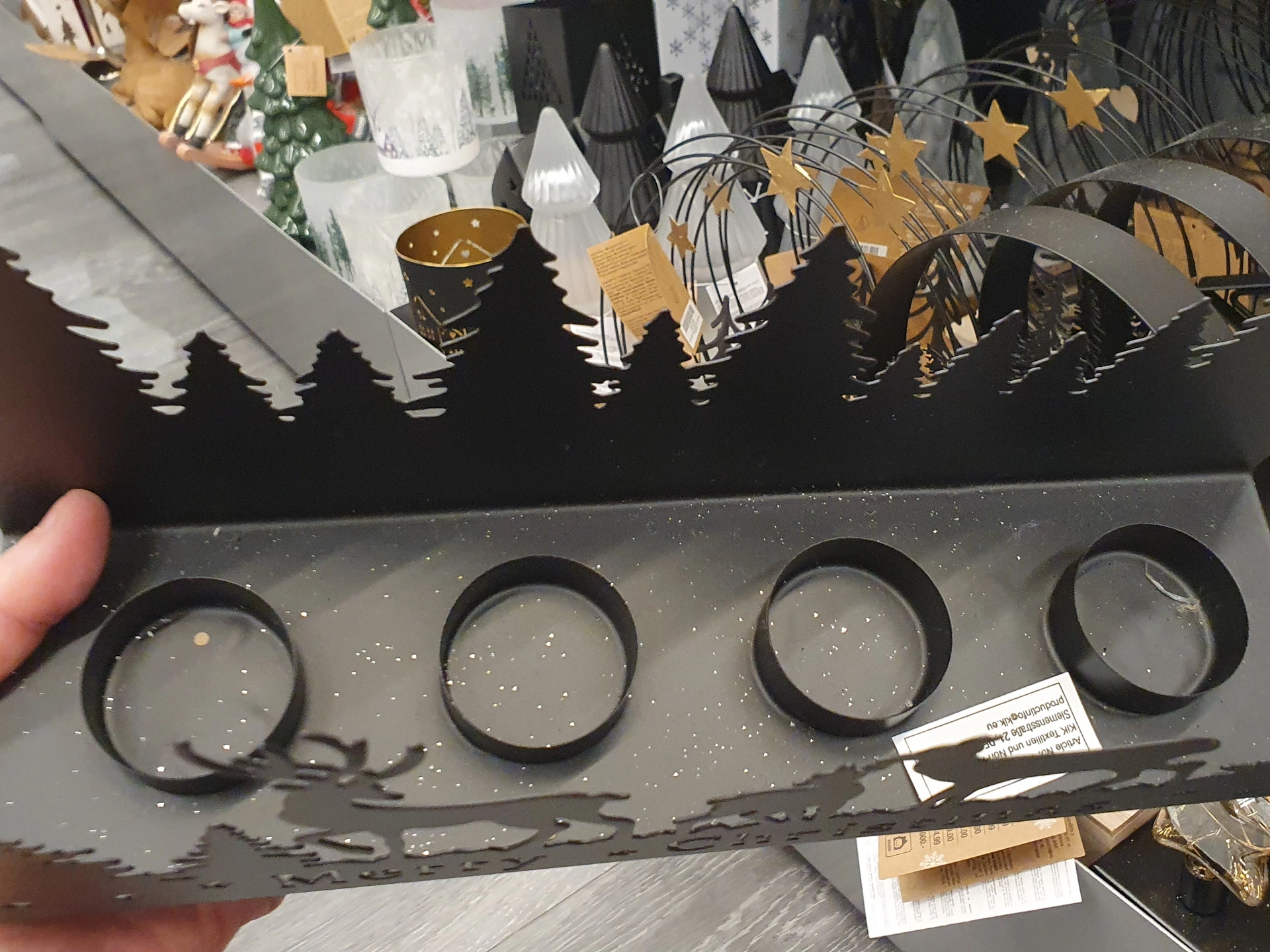 Kovový svícen s motivem lesa a jelena se srnkami je určený na čtyři čajové svíčky. Dole má nápis Merry christmas a výřezy hvězdiček, ale všechny prvky působí velmi nenápadně. Víc vyniknou až při zapálení svíček.