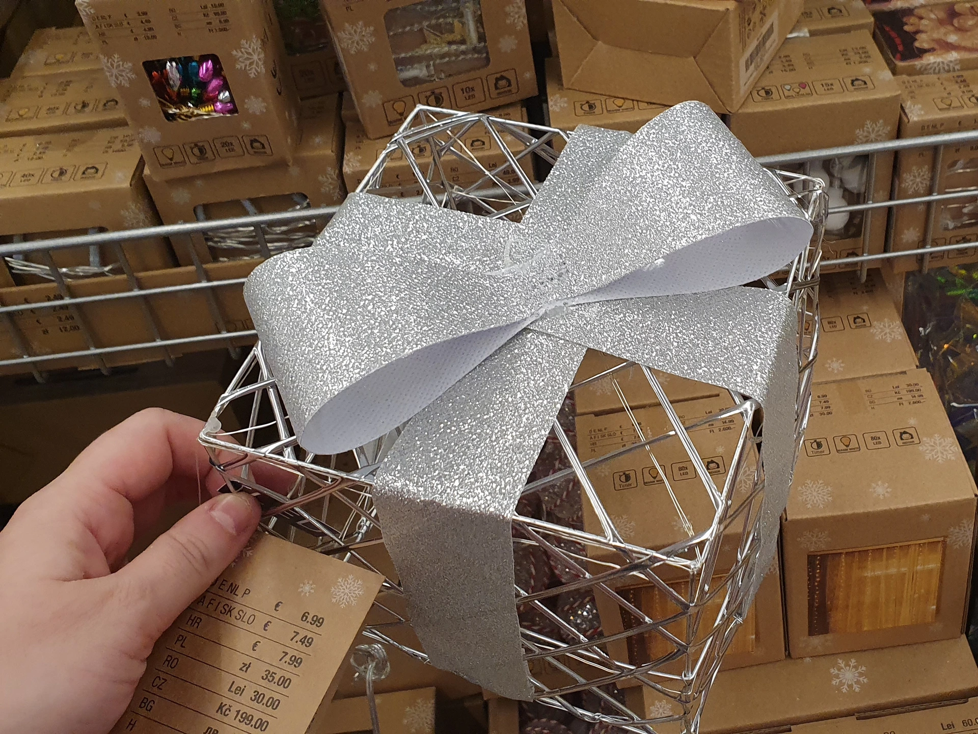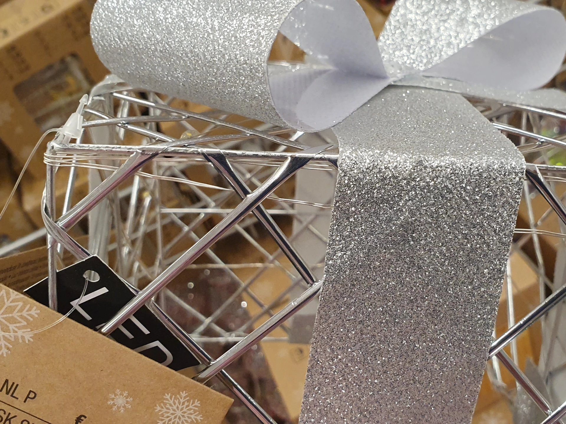 Jemná stříbrná konstrukce ovázaná výraznou stříbrnou mašlí a doplněná světelným řetězem. Díky této kombinaci působí elegantním dojmem. Protože je konstrukce průhledná, bude i osvětlení výraznější. Světelný řetěz je vybavený časovačem pro zapnutí na 6 hodin, 18 hodin denně je vypnutý.