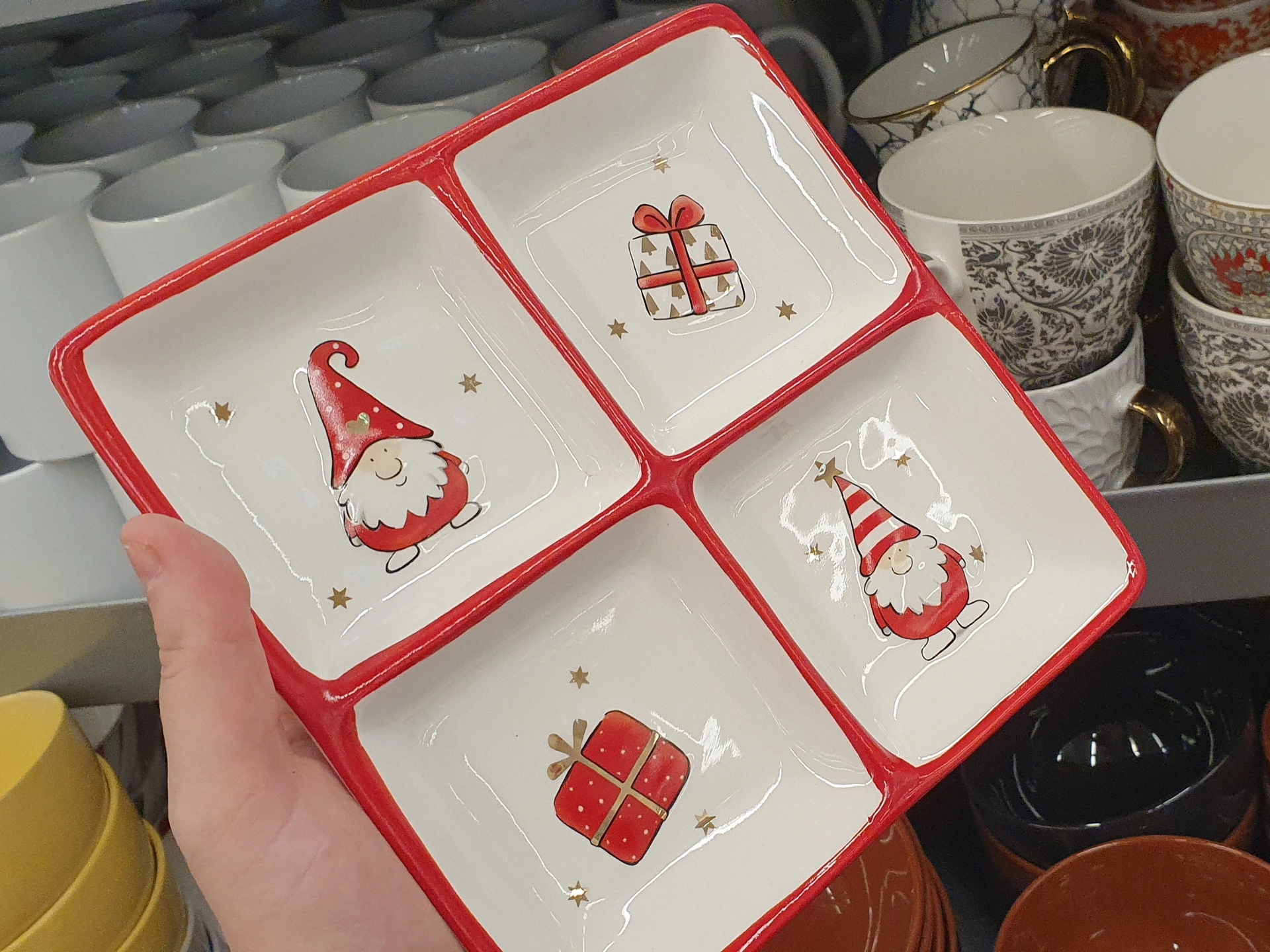 Ideální na podávání menších pochutin je tento podnos, který je rozdělený na čtyři přihrádky. Bílo-červené okraje doplňují obrázky v každé přihrádce – dva trpaslíci a dva dárky. Ty doplňuje další tradiční vánoční zlatá barva, takže se podnos bude vyjímat na svátečním stole.