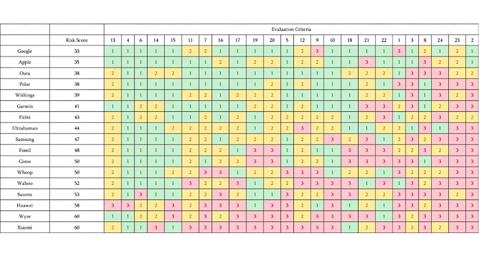 Čínští výrobci ve srovnání zcela propadli kvůli nejasným informacím o sdílení dat, omezené kontrole uživatelů nad jejich sběrem a neexistenci programů pro hlášení zranitelností. Zato Google, Apple či Oura se chlubí propracovaným šifrování, umožňují uživatelům přístup k datům a omezují cílené reklamy.