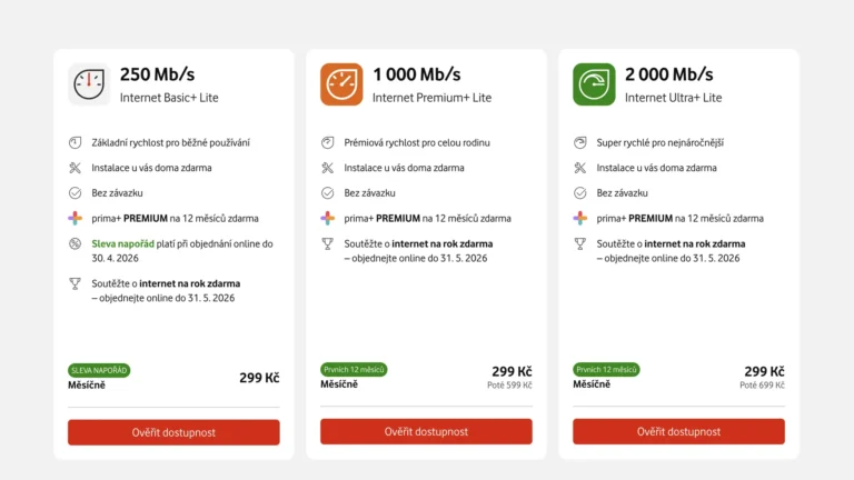 Akční pásmo, které operátor pojmenoval „Sleva napořád“, se týká výhradně nejpomalejšího ze tří tarifů. Internet Basic+ Lite s rychlostí 250 Mb/s má cenu 299 Kč zafixovanou bez časového omezení, pokud si ho objednáte online do 30. dubna 2026 a smlouva uzavřená v této době pak platí dlouhodobě. Tarif najdete v oficiálním přehledu pevného internetu Vodafone i s formulářem pro ověření dostupnosti.