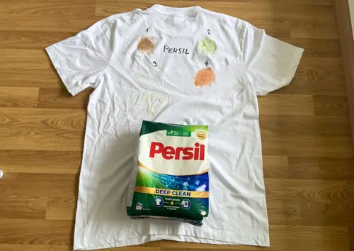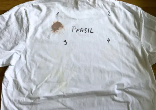Všechny prací prášky jsme testovali na bílých bavlněných tričkách, na která jsme nanesli čtyři typické skvrny z běžného provozu domácnosti – make-up, trávu, opalovací krém a kečup a nechali je zaschnout. Poté jsme trička se skvrnami namočili ve vodě, na znečištěná místa nanesli doporučenou dávku prášku pro silně znečištěné prádlo podle návodu výrobce, nechali prášek 30 minut působit a následovalo praní na 40 °C v běžném programu a usušení. Každou skvrnu jsme samostatně ohodnotili na škále 0–10 bodů, součet 0–40 tak ukazuje, jak si prášek vede čistě z hlediska odstraňování skvrn.