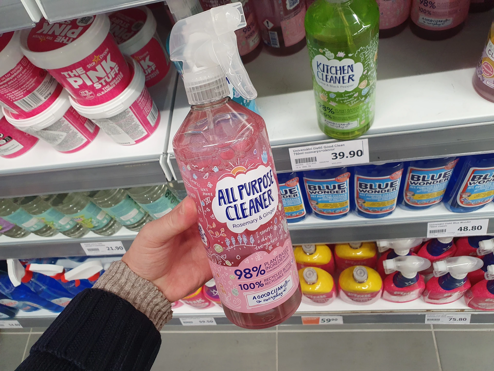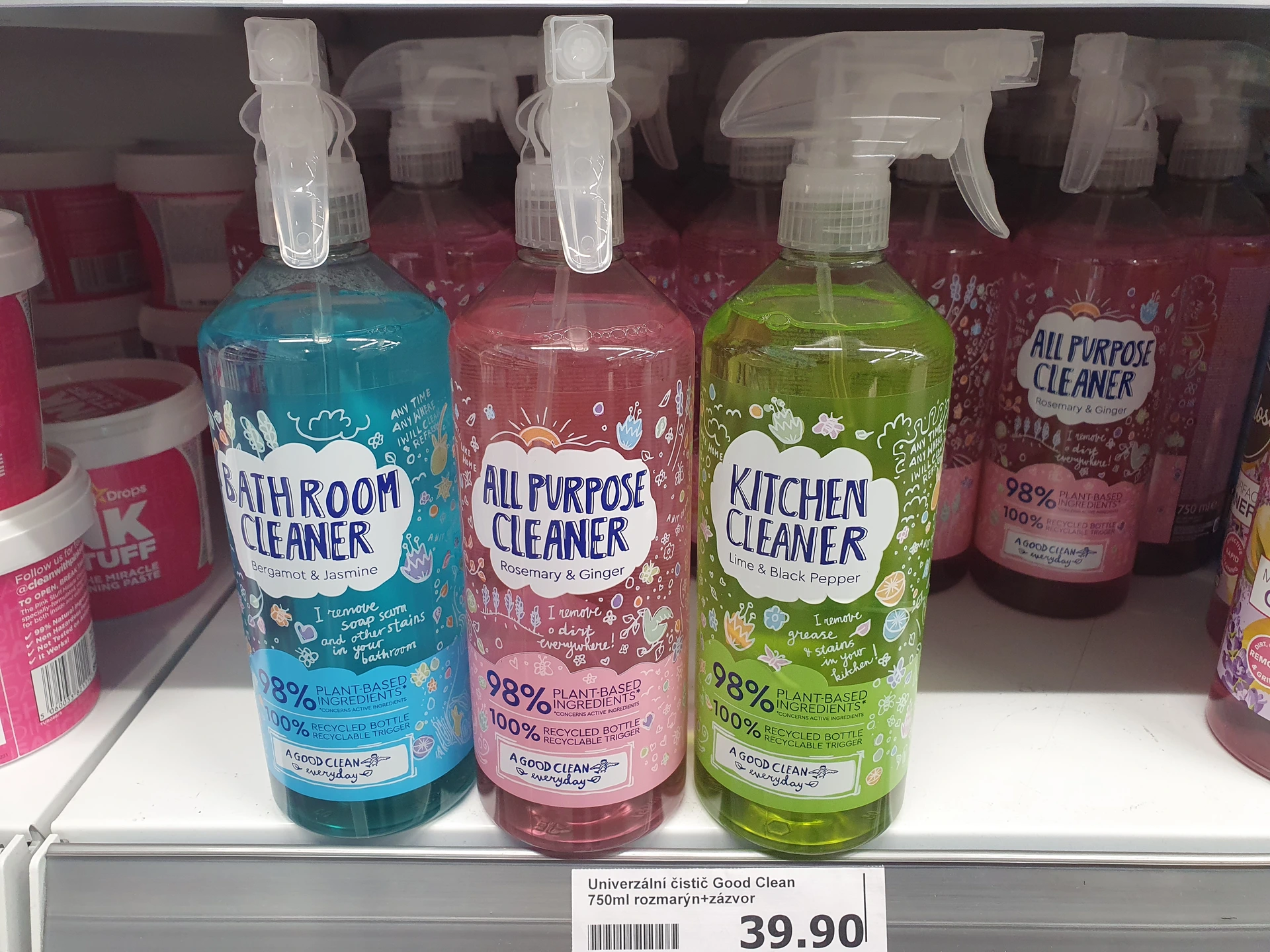 Součástí celé řady čisticích přípravků je univerzální čistič od nizozemské značky A Good Clean. Značka se zaměřuje na ekologické složení, takže 98 % aktivních látek v tomto čističi je přírodního původu a lahev je vyrobená ze 100 % recyklovaného materiálu. Kromě obchodů Action jsme přípravek našli v prodeji v několika e-shopech, jeho cena ale byla výrazně vyšší.