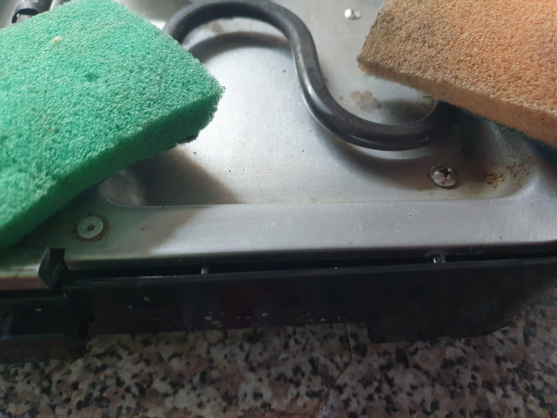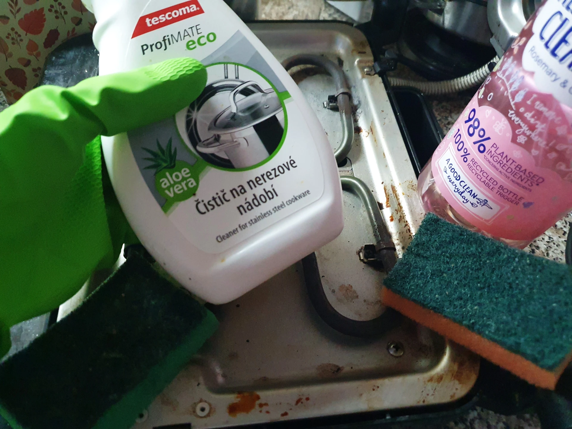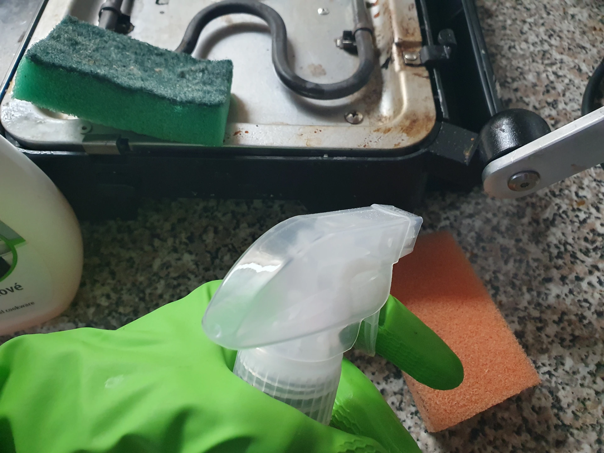 Pro vyzkoušení fungování přípravku na mastné skvrny jsme využili kontaktní gril, který jsme kvůli tomuto účelu nějakou dobu nečistili. Byly na něm tak zaschlé mastné odolné skvrny, které je náročnější odstranit. Pro porovnání jsme použili čistič na nerezové nádobí, chromované a nerezové povrchy od značky Tescoma, který se nám na čištění tohoto kontaktního grilu osvědčil už dřív.