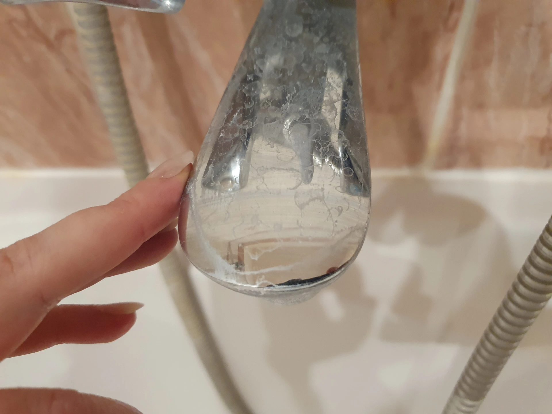 Protože jde o univerzální čistič, zajímalo nás, jestli si poradí i s vodním kamenem způsobeným velmi tvrdou vodou. Pro tento účel jsme opět vodovodní baterii ve vaně nečistili, aby se vytvořily skvrny. Nanesli jsme na ně čistič z Action a po chvíli je zkusili vyleštit pomocí utěrky z mikrovlákna. Přesto, že byla baterie lesklejší, většina skvrn na ní zůstala.