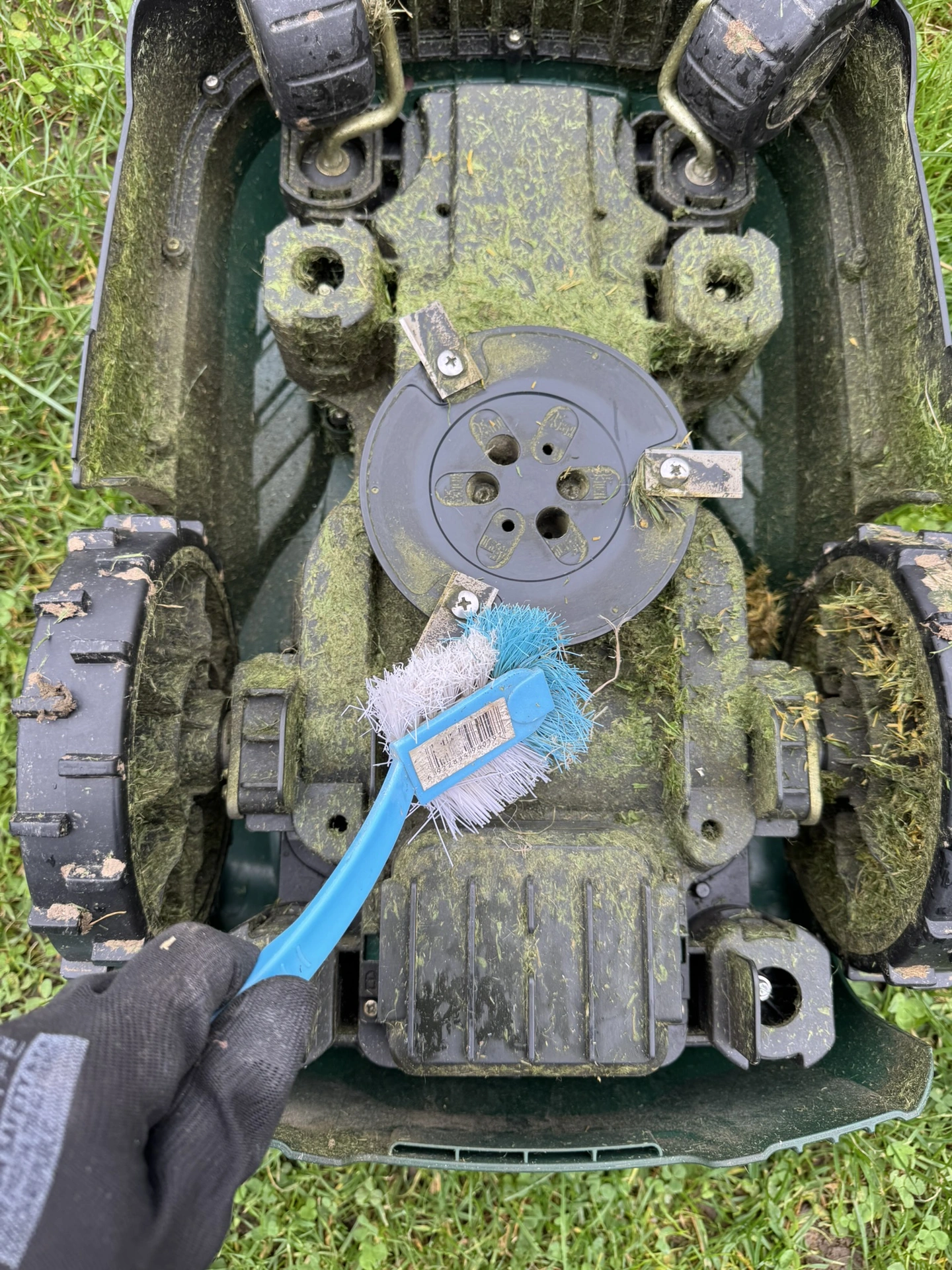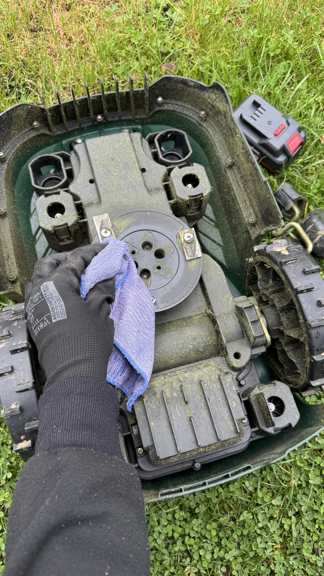 - Sekačku vyčistěte (viz návod pro benzínový stroj), v případě robotické sekačky použijte šetrné čištění (například kartáč na nádobí a dočištění vlhkým hadrem) a nezapomeňte očistit základnu a prostor okolo ní, důkladně očistěte nabíjecí kontakty na stroji i stanici, prvky pro orientaci – kamery, čidla, nárazník, prostor okolo žacího systému a podobně.