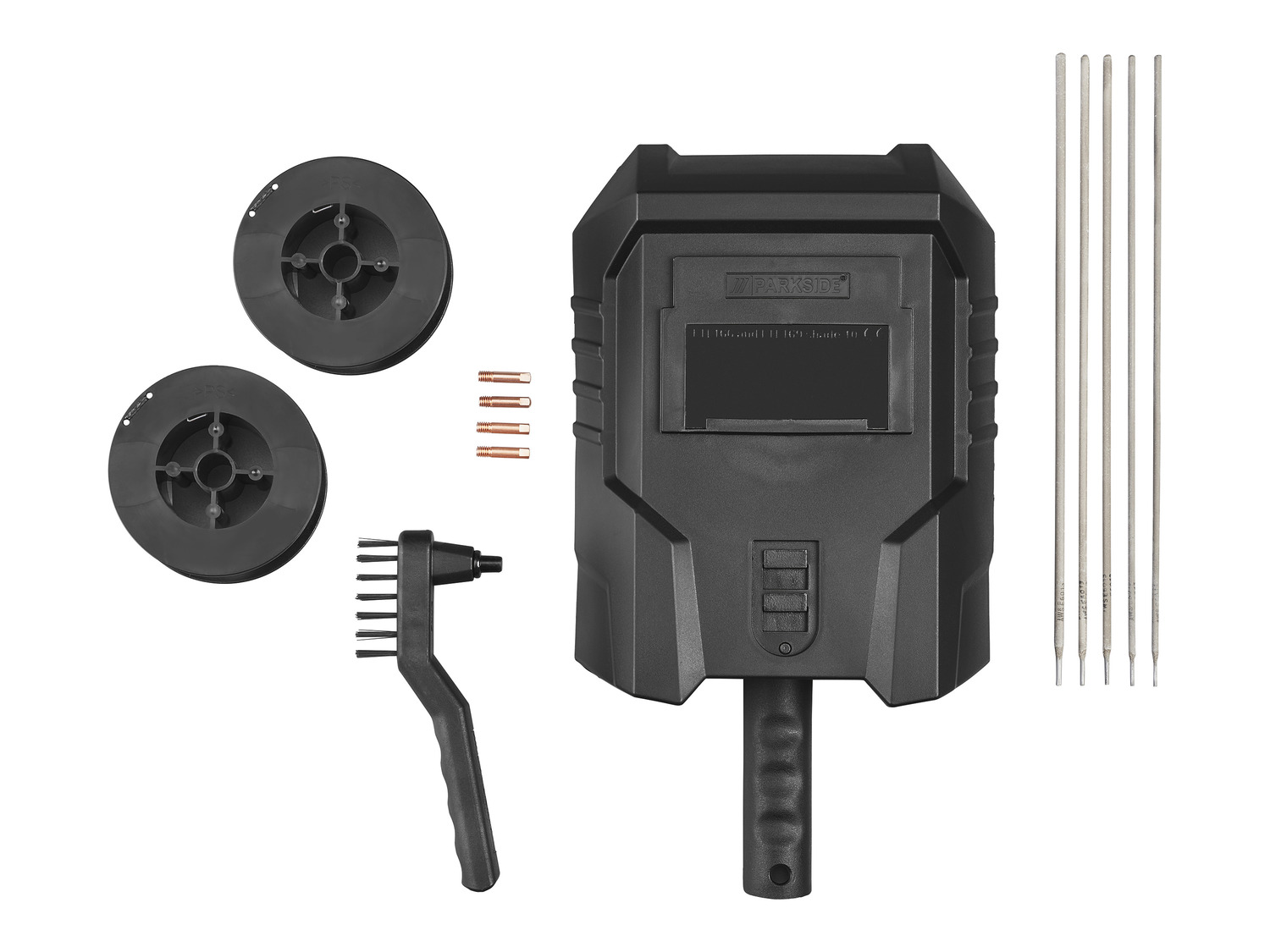 - Příslušenství – Příslušenství, se kterým je tato multisvářečka od Parkside dodávána, zahrnuje držák elektrod, svařovací elektrody, MIG hořák, svařovací dráty, různé trysky, svářečský štít a kvalitní kladivo na škváru.
