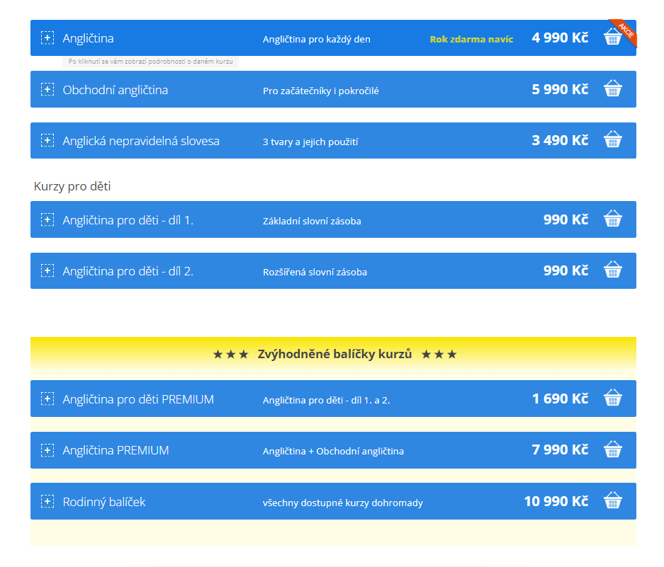 Kurz Angličtina bez biflování patří mezi ty levnější. Funguje na principu předplatného, nikoli ale na krátkou dobu. V kategorii základních kurzů jsou kurzy dostupné vždy na rok, mezi zvýhodněnými balíčky ale najdete i rodinný balíček s 10letým přístupem nebo platinovou verzi navždy. Zde dostane ke kurzu přístup rovnou několik osob.