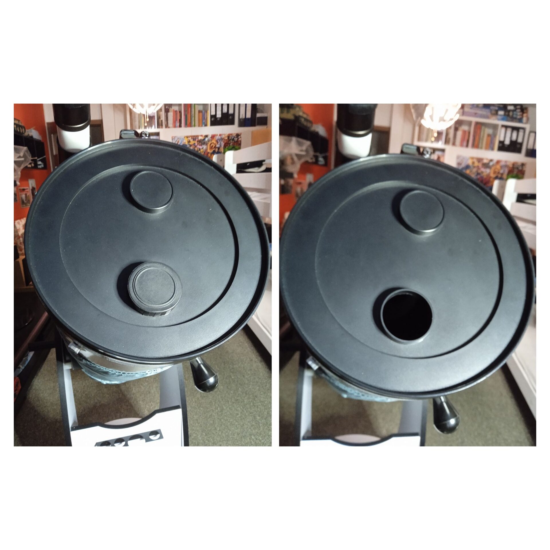 Tento kryt má pochopitelně primární funkci, kterou je uzavření tubusu v době nepoužívání teleskopu, aby na zrcadla nepadal prach. Ale u tohoto teleskopu má ještě jednu, „skrytou“ funkci.