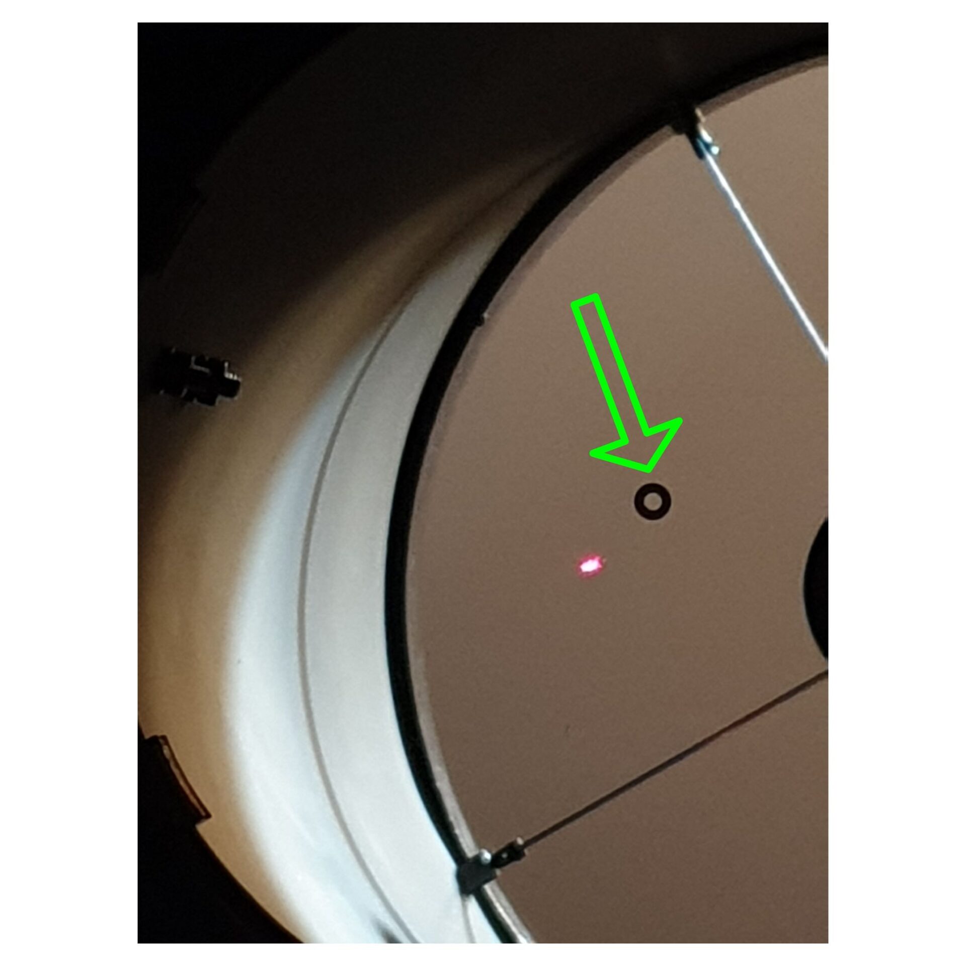 První se kolimuje sekundární zrcadlo. Když kolimátor zapnete, tak vyšle laserový paprsek, který dopadne na primární zrcadlo, u kterého si můžete všimnout, že má uprostřed takový kroužek – to je střed zrcadla. Pokud paprsek dopadá přesně do středu nebo aspoň na zmíněný kroužek, tak je to v pohodě. Pokud dopadá mimo tento kroužek, tak je potřeba kolimace.