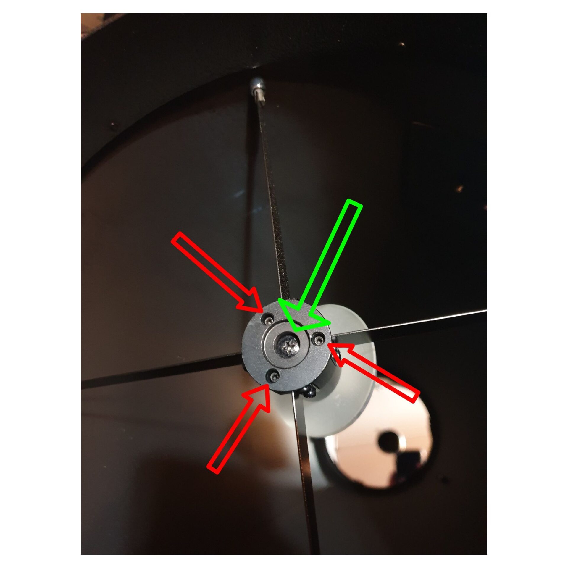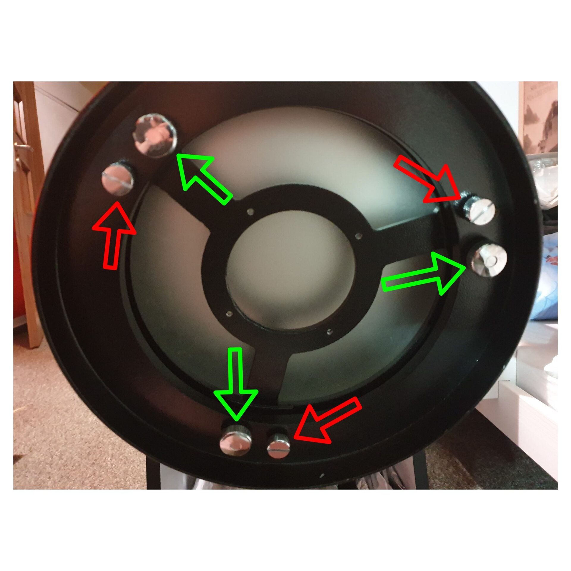 Při povolování/dotahování kolimačních šroubů se bude na primárním zrcadle pohybovat i laserový paprsek. Takže budete jednotlivé šrouby postupně povolovat a dotahovat tak dlouho, dokud nebude paprsek dopadat do středového kroužku na primárním zrcadle.