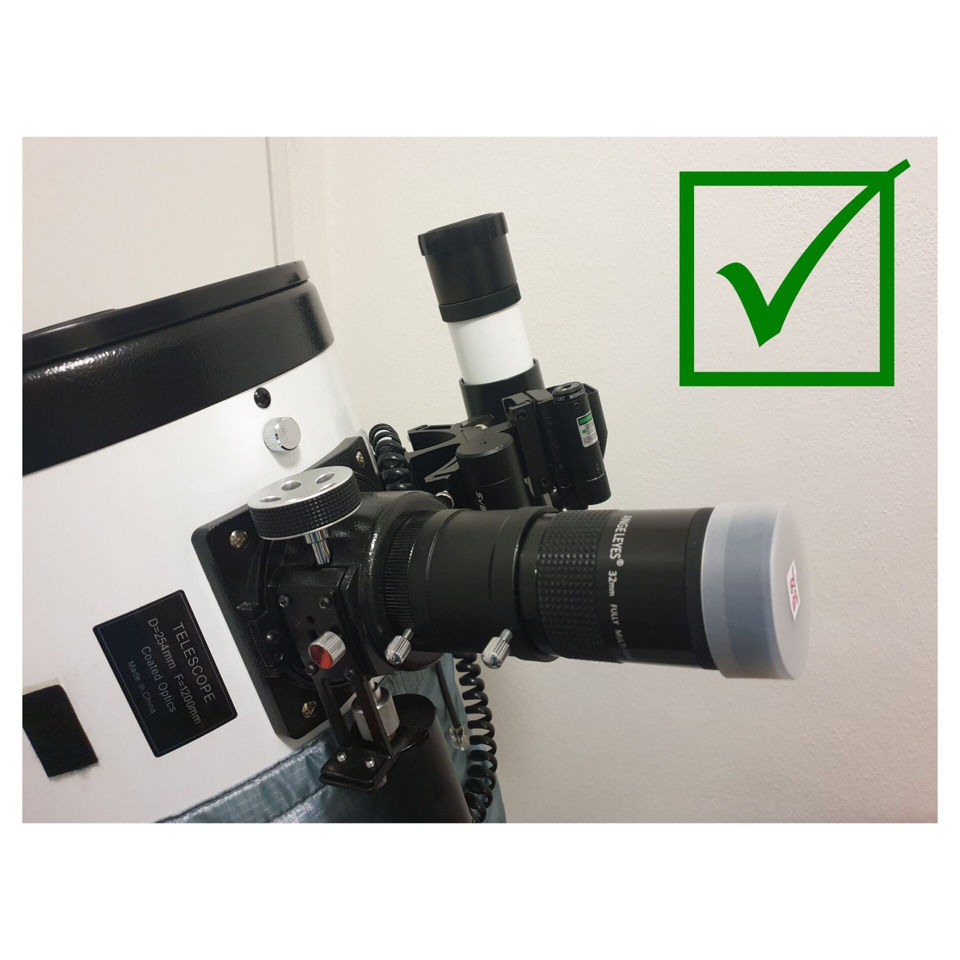 Takže doporučuji následně v noci zaměřit teleskop skrze optický hledáček na Polárku a následně zkontrolovat v teleskopu, jestli se nachází v jeho středu. Pokud ne, tak ji tam pohybem teleskopu dostaneme a následně upravíme aretaci na hledáčku.