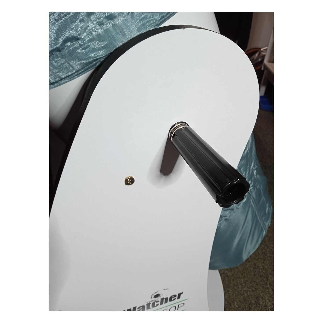Tubus se následně usazuje do sestavené Dobsonovi montáže, kde jej zajistíte dvojicí šroubů s madlem, které je pak možné použít i pro transport. Ale pozor, v jednom člověku je jeho transport, ve složeném stavu, v podstatě nemožný a je třeba jej přemisťovat na dvě části – montáž a pak tubus.
