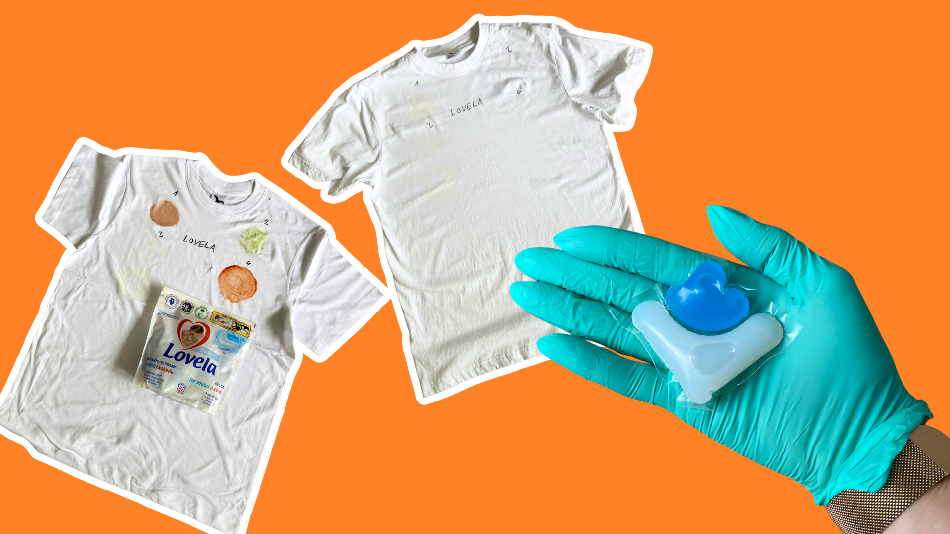 LOVELA Baby gelové kapsle na praní jsou prací kapsle na dětské prádlo, které mohou využít i lidé s citlivou pokožkou. Testem produkt prošel velice dobře, menší problém mu dělal make-up a opalovací krém. Trávu a kečup naopak vypral dokonale. Z našeho srovnání má ovšem nejvyšší cenu. Po vyprání tričko vonělo svěží, lehce květinovou vůní.