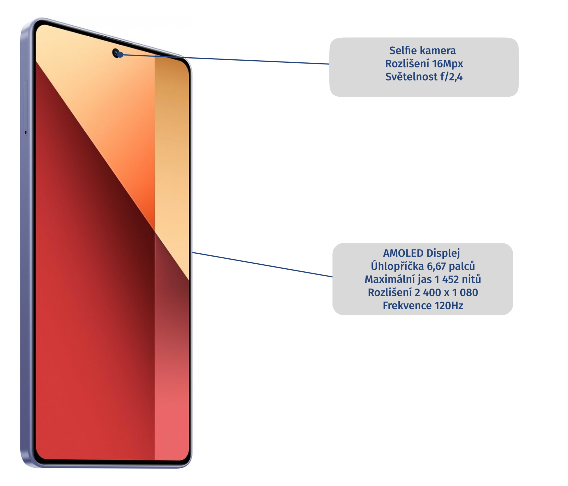 Na první pohled se designově určitě jedná o nejzajímavěji vypadající telefon řady Xiaomi Redmi Note 13, a to především díky krásné fialové barvě společně s dvěma velkými kamerovými čočkami. Nám zapůjčená fialová barva také velmi napomáhá designu telefonu a vytváří elegantní vzhled zařízení.