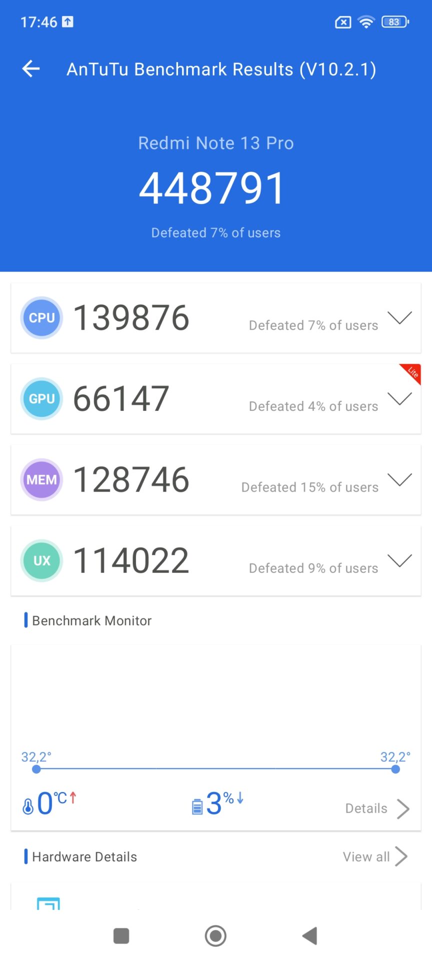 Když se snažíte vytvořit telefon, který umí pouze 4G, je nutné, aby jste našli vhodný procesor. V případě tohoto telefonu se jedná o osmijádrový Helio G99 Ultra, který v testu AnTuTu obdržel celkem podprůměrných 448 791 bodů. Za zmínku pak stojí i fakt, že základní verze Xiaomi Redmi Note 13 5G získala o 10 000 bodů více a celkově v ruce působila svižněji.